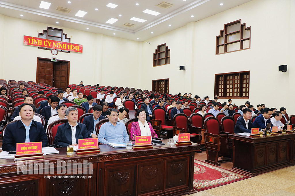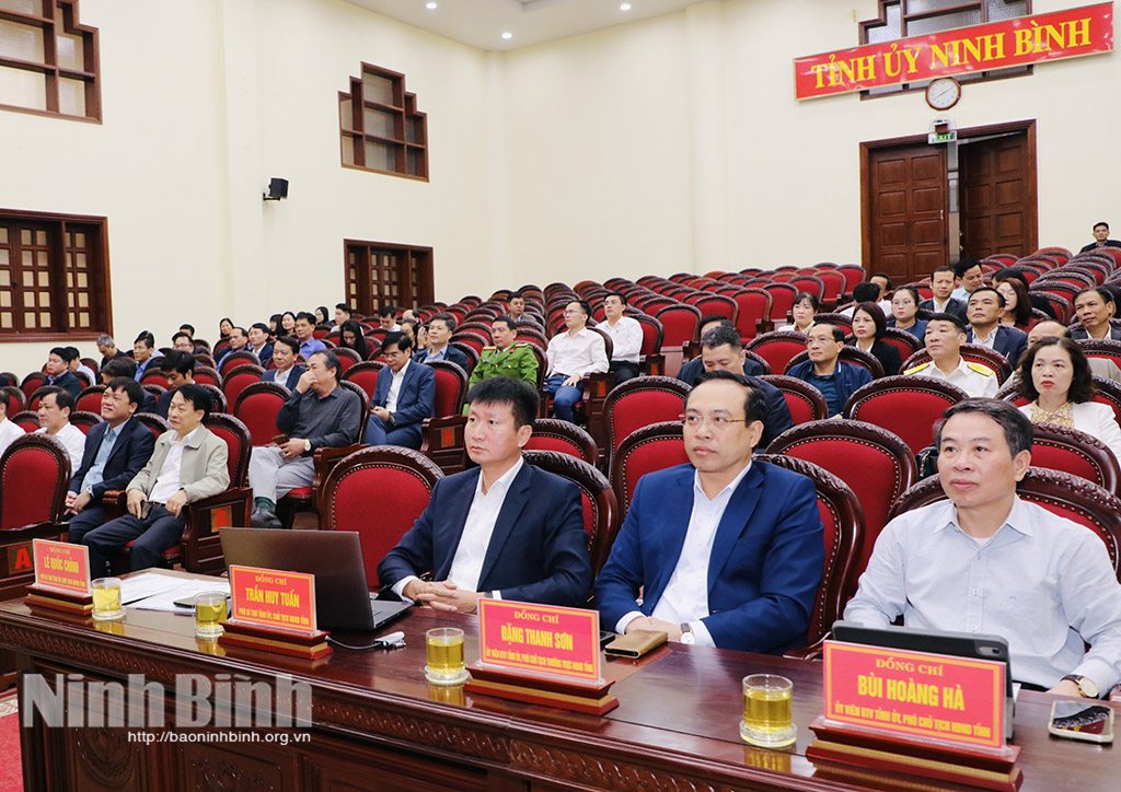 Dự hội nghị tại điểm cầu tỉnh Ninh Bình có các đồng chí: Đinh Thị Lụa, Phó Bí thư Thường trực Tỉnh ủy; Trần Huy Tuấn, Phó Bí thư Tỉnh ủy, Chủ tịch UBND tỉnh; các đồng chí Ủy viên Ban Thường vụ Tỉnh uỷ, Thường trực HĐND, lãnh đạo UBND, Ủy ban MTTQ Việt Nam, các tổ chức chính trị - xã hội của tỉnh; các đồng chí Ủy viên Ban Chấp hành Đảng bộ tỉnh; lãnh đạo các sở, ban, ngành của tỉnh.