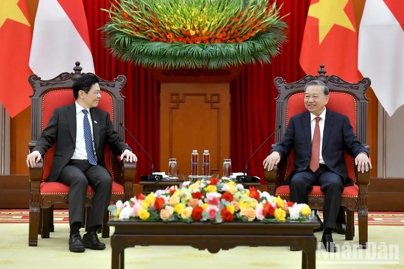 Tổng Bí thư Tô Lâm hoan nghênh và bày tỏ vui mừng gặp lại Thủ tướng Lawrence Wong ngay sau khi hai nước nâng cấp quan hệ lên Đối tác chiến lược toàn diện; nhấn mạnh ý nghĩa quan trọng của chuyến thăm lần này, thể hiện tinh thần tích cực triển khai, cụ thể hóa nội hàm, định hướng quan hệ song phương thời gian tới, mở đầu chương hợp tác mới giữa hai nước, đồng thời thể hiện mối quan hệ ngày càng gắn bó, tin cậy hiệu quả và sinh động giữa hai nước.