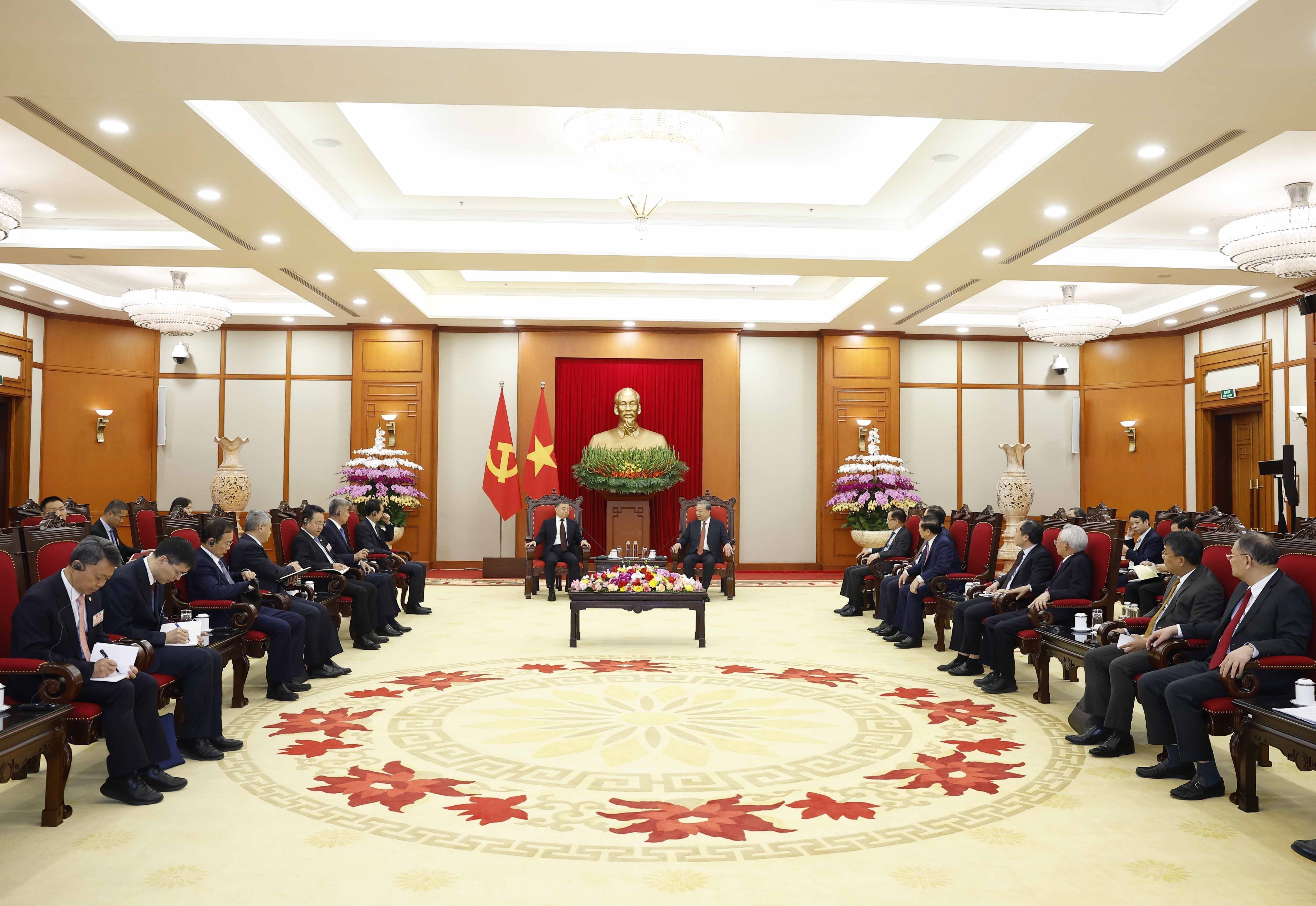 Tổng Bí thư Tô Lâm tiếp đồng chí Lý Thư Lỗi, Ủy viên Bộ Chính trị, Bí thư Ban Bí thư, Trưởng Ban Tuyên truyền Trung ương, Đảng Cộng sản Trung Quốc. Ảnh: Thống Nhất - TTXVN