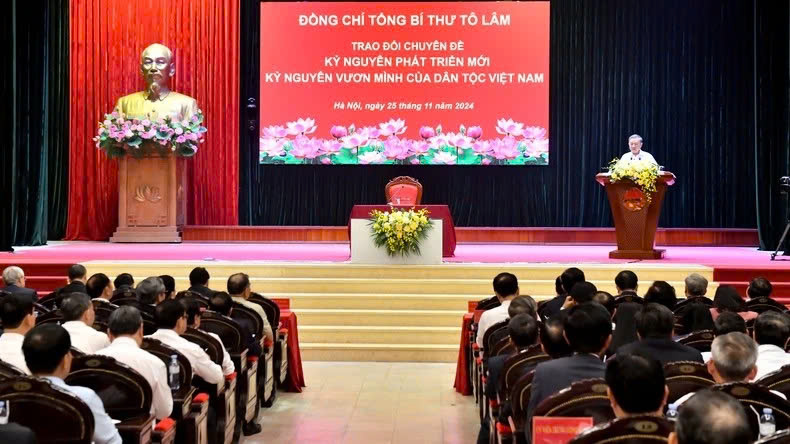 Chiều 25/11, tại Học viện Chính trị quốc gia Hồ Chí Minh, Tổng Bí thư Tô Lâm đã trao đổi chuyên đề: Kỷ nguyên phát triển mới, kỷ nguyên vươn mình của dân tộc Việt Nam. Đây là chuyên đề đặc biệt quan trọng để chuẩn bị cho việc xây dựng, hoàn thiện văn kiện đại hội đảng bộ các ngành, các cấp, các địa phương, tiến tới Đại hội lần thứ XIV của Đảng và định hướng xây dựng, phát triển đất nước, bảo vệ Tổ quốc trong kỷ nguyên mới.