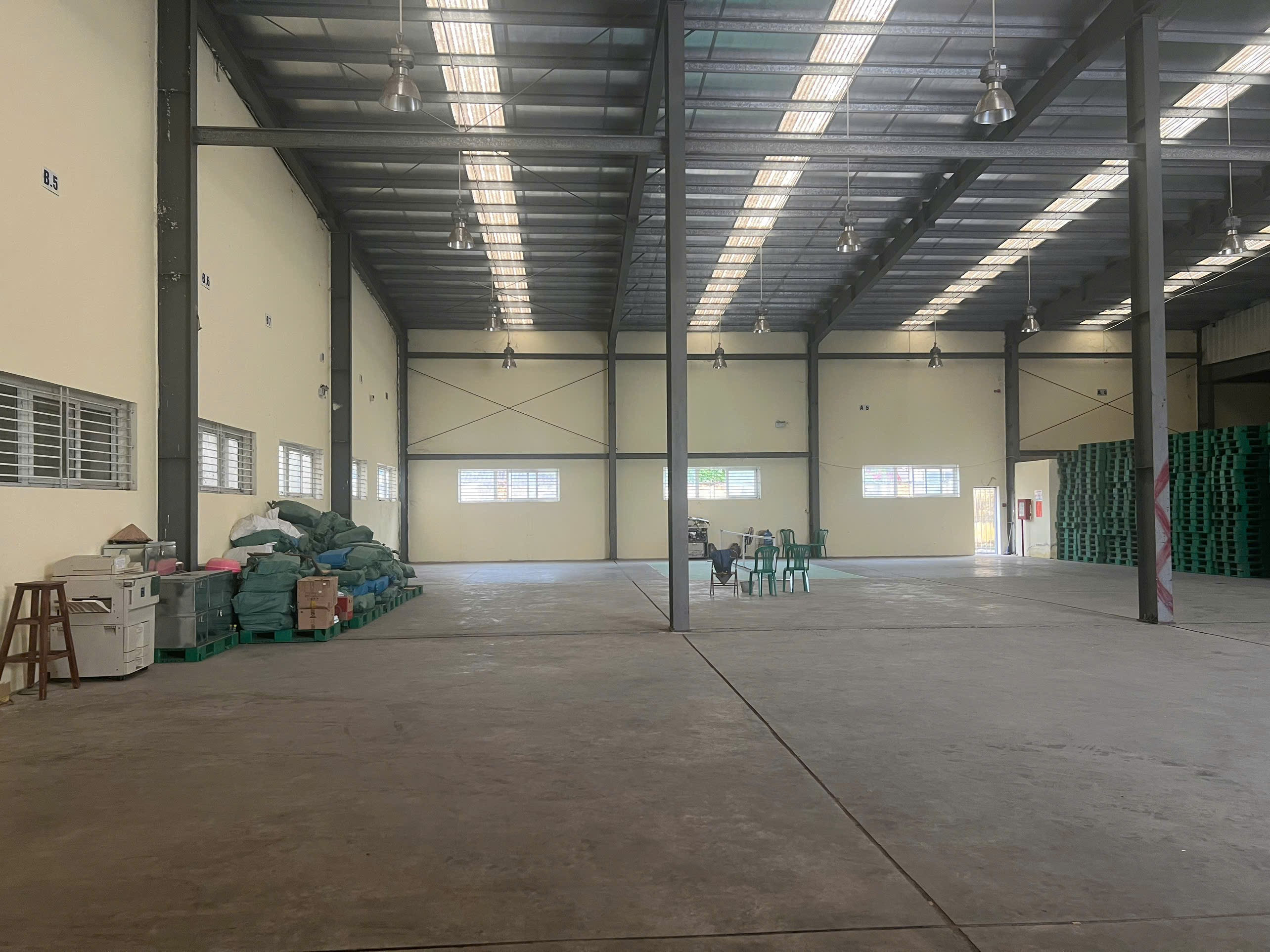 Nhà kho xưởng số 2: khung cột thép, tường gạch, mái tôn, sàn bê tông, cửa đi nhôm cuốn tự động, cửa sổ nhôm kính.