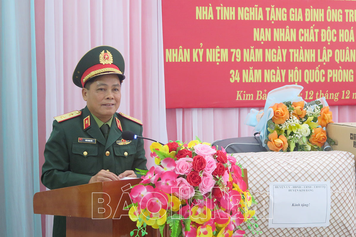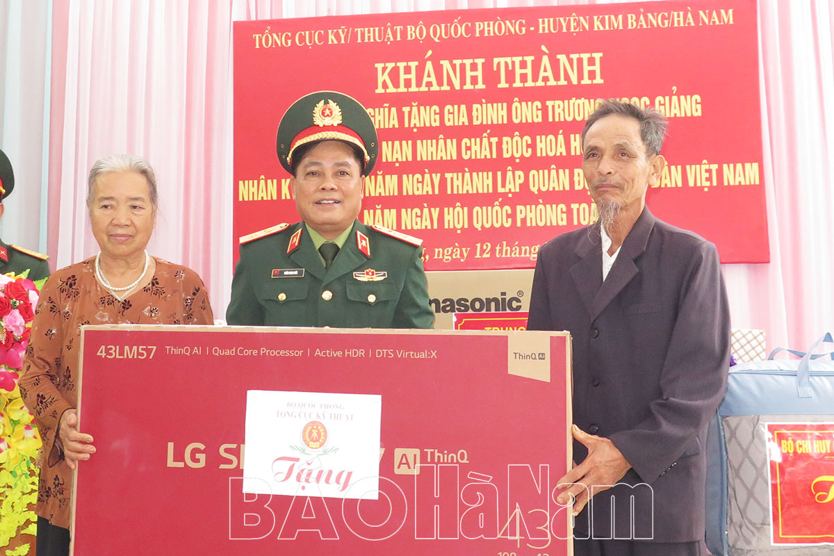 Hướng tới kỷ niệm 79 năm Ngày thành lập Quân đội nhân dân Việt Nam (22/12/1944-22/12/2023), 34 năm Ngày hội Quốc phòng toàn dân, sáng 12/12, Tổng cục Kỹ thuật Bộ Quốc phòng phối hợp với Ban CHQS huyện Kim Bảng tổ chức khánh thành, bàn giao nhà tình nghĩa tặng gia đình ông Trương Ngọc Giảng (tại tổ dân phố số 1, thị trấn Quế, huyện Kim Bảng).
