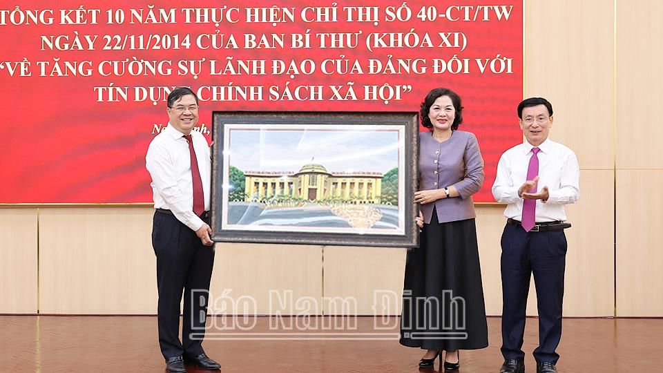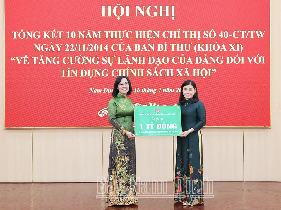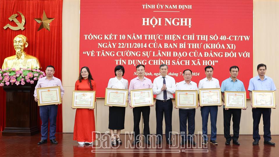 Ghi nhận thành tích, đóng góp trong 10 năm thực hiện Chỉ thị số 40-CT/TW, 17 tập thể, 13 cá nhân được Chủ tịch UBND tỉnh tặng Bằng khen; 9 tập thể được Tổng Giám đốc NHCSXH Việt Nam tặng Giấy khen; nhiều tập thể, cá nhân được NHNN Chi nhánh tỉnh Nam Định tặng Giấy khen./.
