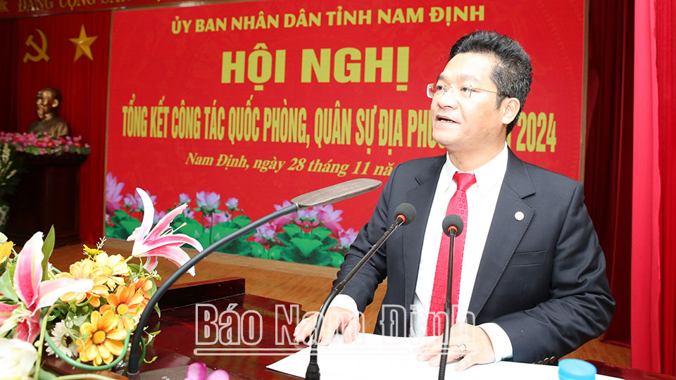 Phát biểu kết luận hội nghị, đồng chí Phó Chủ tịch Thường trực UBND tỉnh Trần Anh Dũng và Thiếu tướng Lương Văn Kiểm, Phó Tư lệnh Quân khu 3 biểu dương, ghi nhận và đánh giá cao những kết quả, thành tích mà LLVT tỉnh và các địa phương, cơ quan, đơn vị đã đạt được trong năm 2024. Các đồng chí đề nghị cấp ủy, chính quyền các địa phương; lãnh đạo các sở, ngành, LLVT tỉnh tiếp tục quán triệt, triển khai các nghị quyết của Đảng, chỉ đạo của Bộ Quốc phòng, Quân khu 3 và Nghị quyết của Ban TVTU về công tác QP, QSĐP năm 2025. Tiếp tục thực hiện có hiệu quả Kết luận số 64-KL/TW của Bộ Chính trị (khóa XII) đẩy mạnh thực hiện Nghị quyết số 28-NQ/TW về “Tiếp tục xây dựng các tỉnh, thành phố trực thuộc Trung ương thành khu vực phòng thủ vững chắc trong tình hình mới”. Thực hiện tốt công tác quản lý Nhà nước về quốc phòng. Hoàn thành 100% chỉ tiêu giao quân năm 2025 bảo đảm an toàn, đúng luật. Duy trì nghiêm chế độ trực sẵn sàng chiến đấu; chủ động triển khai thực hiện hiệu quả các biện pháp phòng, chống thiên tai, tìm kiếm cứu nạn... Tiếp tục triển khai xây dựng các công trình quân sự trong khu vực phòng thủ tỉnh theo Kế hoạch của UBND tỉnh về triển khai thực hiện Quy hoạch thế trận quân sự trong khu vực phòng thủ tỉnh, huyện, thành phố giai đoạn 2021-2025 và những năm tiếp theo; triển khai giải phóng mặt bằng, bàn giao đất thực hiện dự án xây dựng doanh trại Trung đoàn 8, Sư đoàn 395 tại huyện Nam Trực. Tăng cường công tác giáo dục, bồi dưỡng kiến thức QPAN cho các đối tượng. Phối hợp với các sở, ngành tham mưu cho UBND tỉnh xây dựng và trình HĐND tỉnh Đề án “Triển khai thực hiện Quyết định số 25/QĐ-TTg ngày 13/3/2024 của Thủ tướng Chính phủ và xây dựng trụ sở Ban CHQS cấp xã giai đoạn 2024-2030”; Đề án “Hỗ trợ công dân nhập ngũ, công dân thực hiện nghĩa vụ tham gia Công an nhân dân trên địa bàn tỉnh Nam Định”; Nghị quyết quy định mức phụ cấp hàng tháng đối với thôn đội trưởng, mức trợ cấp ngày công đối với dân quân khi thực hiện nhiệm vụ. Đẩy mạnh phong trào thi đua Quyết thắng gắn với phong trào thi đua yêu nước.