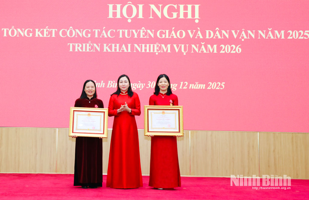 Phát biểu chỉ đạo tại hội nghị, đồng chí Đinh Thị Lụa, Phó Bí thư Thường trực Tỉnh ủy ghi nhận và biểu dương những kết quả trong năm 2025 mà ngành Tuyên giáo và Dân vận đã đạt được. Đồng chí Phó Bí thư Thường trực Tỉnh ủy nhấn mạnh: Năm 2025, thực hiện chỉ đạo của Bộ Chính trị, Ban Bí thư Trung ương; Chương trình công tác toàn khóa của Ban Chấp hành Đảng bộ tỉnh; Chương trình công tác năm 2025 của Ban Thường vụ Tỉnh ủy, với tinh thần đoàn kết, nỗ lực khắc phục khó khăn, Ban Chấp hành Đảng bộ tỉnh, Ban Thường vụ Tỉnh ủy đã tập trung lãnh đạo, chỉ đạo khẩn trương, quyết liệt, đồng bộ, kịp thời nhiều giải pháp, phát huy sức mạnh của cả hệ thống chính trị, sự nỗ lực của cộng đồng doanh nghiệp, sự đồng thuận của nhân dân, triển khai việc sắp xếp tổ chức bộ máy và vận hành chính quyền địa phương hai cấp, bảo đảm nguyên tắc tinh gọn - hiệu lực - hiệu quả. Cụ thể, công tác xây dựng Đảng, xây dựng hệ thống chính trị được chú trọng, triển khai đồng bộ; việc sắp xếp đơn vị hành chính cấp xã, cấp tỉnh được thực hiện đúng tiến độ, bảo đảm chất lượng; bộ máy mới nhanh chóng đi vào hoạt động ổn định, thông suốt, không để gián đoạn nhiệm vụ. Về thực hiện nhiệm vụ phát triển kinh tế - xã hội tiếp tục có nhiều chuyển biến tích cực. Năm 2025, tổng sản phẩm xã hội (GRDP) trên địa bàn tỉnh tăng 10,65%, nằm trong top đầu những tỉnh, thành phố đạt mức tăng trưởng hai con số (xếp thứ 3 vùng đồng bằng Sông Hồng và thứ 3 toàn quốc); GRDP bình quân đầu người đạt 89,19 triệu đồng; tổng thu ngân sách trên địa bàn ước đạt 75.851 tỷ đồng, tăng 37% so với năm 2024. Cơ cấu kinh tế chuyển dịch tích cực. Công tác xây dựng nông thôn mới được quan tâm chỉ đạo, được Ban Chỉ đạo Trung ương đánh giá cao trong triển khai thực hiện. Chất lượng giáo dục toàn diện được nâng lên, giáo dục mũi nhọn đạt thành tích tốt. Trong kỳ thi tốt nghiệp trung học phổ thông quốc gia năm 2025, Ninh Bình đứng thứ 03/34 tỉnh, thành có điểm bình quân cao nhất cả nước. Quốc phòng được củng cố vững chắc; an ninh chính trị, trật tự an toàn xã hội được giữ vững; công tác đối ngoại được triển khai đồng bộ, toàn diện, hiệu quả, hội nhập quốc tế đi vào chiều sâu; an sinh xã hội được bảo đảm. Những kết quả nổi bật của tỉnh trong năm 2025 có sự đóng góp quan trọng của đội ngũ cán bộ ngành Tuyên giáo và Dân vận từ tỉnh đến cơ sở.