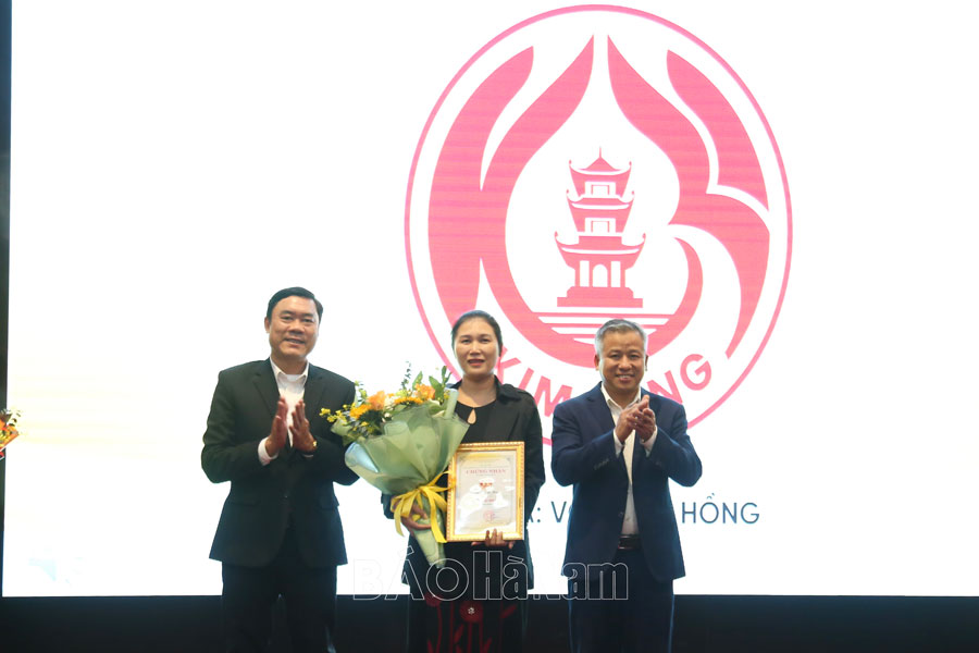 Đại diện lãnh đạo Sở Văn hóa, Thể thao và Du lịch và huyện Kim Bảng trao giấy khen, phần thưởng cho tác giả đạt giải Nhất trong cuộc thi.