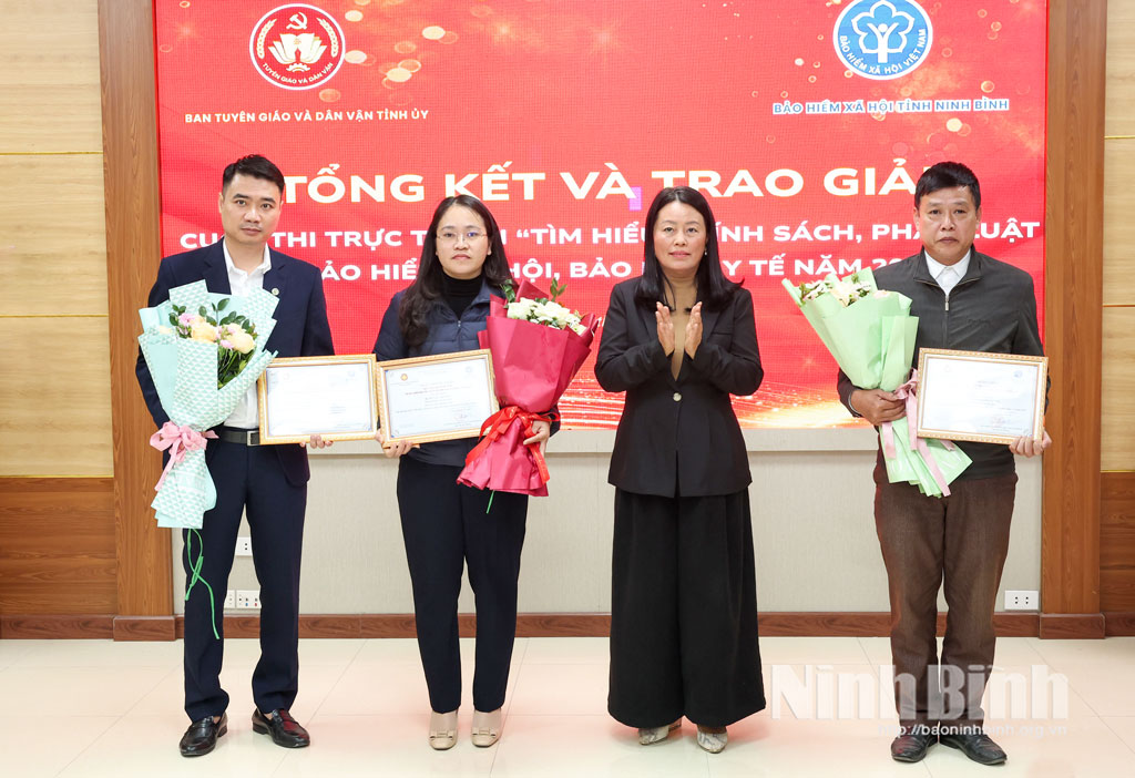 Đồng chí Nguyễn Đức Toàn, Ủy viên Ban Thường vụ Tỉnh ủy, Trưởng Ban Tuyên giáo và Dân vận Tỉnh ủy, Trưởng Ban Chỉ đạo Cuộc thi và đồng chí Giám đốc BHXH tỉnh tặng hoa chúc mừng, trao Giấy chứng nhận giải Nhất cho tập thể Đảng bộ phường Hoa Lư.Lãnh đạo BHXH tỉnh trao giải Nhất cho các cá nhân đoạt giải.