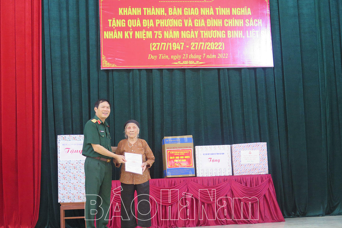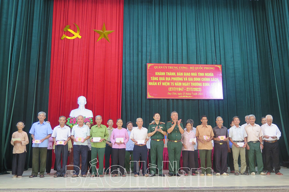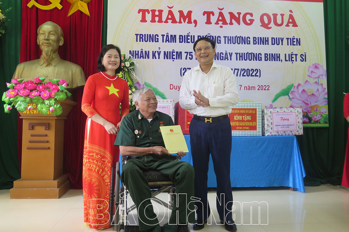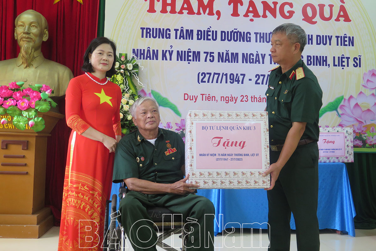 Thay mặt Quân ủy Trung ương, Bộ Quốc phòng, Thượng tướng Nguyễn Tân Cương đã trao quà của Bộ Quốc phòng tặng các TBB và Trung tâm Điều dưỡng thương binh Duy Tiên. Nhân dịp này, lãnh đạo Bộ Tổng Tham mưu, Quân khu 3, lãnh đạo tỉnh và Bộ CHQS tỉnh, thị xã Duy Tiên đã tặng quà, động viên các TBB tại trung tâm.