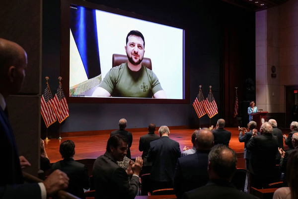 Xuất hiện trên màn hình lớn được trình chiếu giữa phòng họp Hạ viện Mỹ, Tổng thống Zelensky nhận được sự chào đón từ các nghị sĩ lưỡng đảng khi ông chuẩn bị đọc bài phát biểu trực tuyến, được cho là từ thủ đô Kiev.