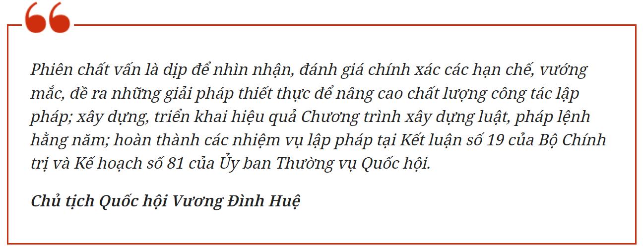 Phiên chất vấn là dịp để nhìn nhận, đánh giá chính xác các hạn chế, vướng mắc, đề ra những giải pháp thiết thực để nâng cao chất lượng công tác lập pháp; xây dựng, triển khai hiệu quả Chương trình xây dựng luật, pháp lệnh hằng năm; hoàn thành các nhiệm vụ lập pháp tại Kết luận số 19 của Bộ Chính trị và Kế hoạch số 81 của Ủy ban Thường vụ Quốc hội.