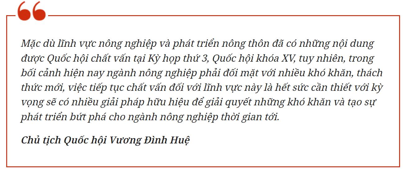 Chủ tịch Quốc hội nêu rõ, mặc dù lĩnh vực nông nghiệp và phát triển nông thôn đã có những nội dung được Quốc hội chất vấn tại Kỳ họp thứ 3, Quốc hội khóa XV, tuy nhiên, trong bối cảnh hiện nay ngành nông nghiệp phải đối mặt với nhiều khó khăn, thách thức mới, việc tiếp tục chất vấn đối với lĩnh vực này là hết sức cần thiết với kỳ vọng sẽ có nhiều giải pháp hữu hiệu để giải quyết những khó khăn và tạo sự phát triển bứt phá cho ngành nông nghiệp thời gian tới.