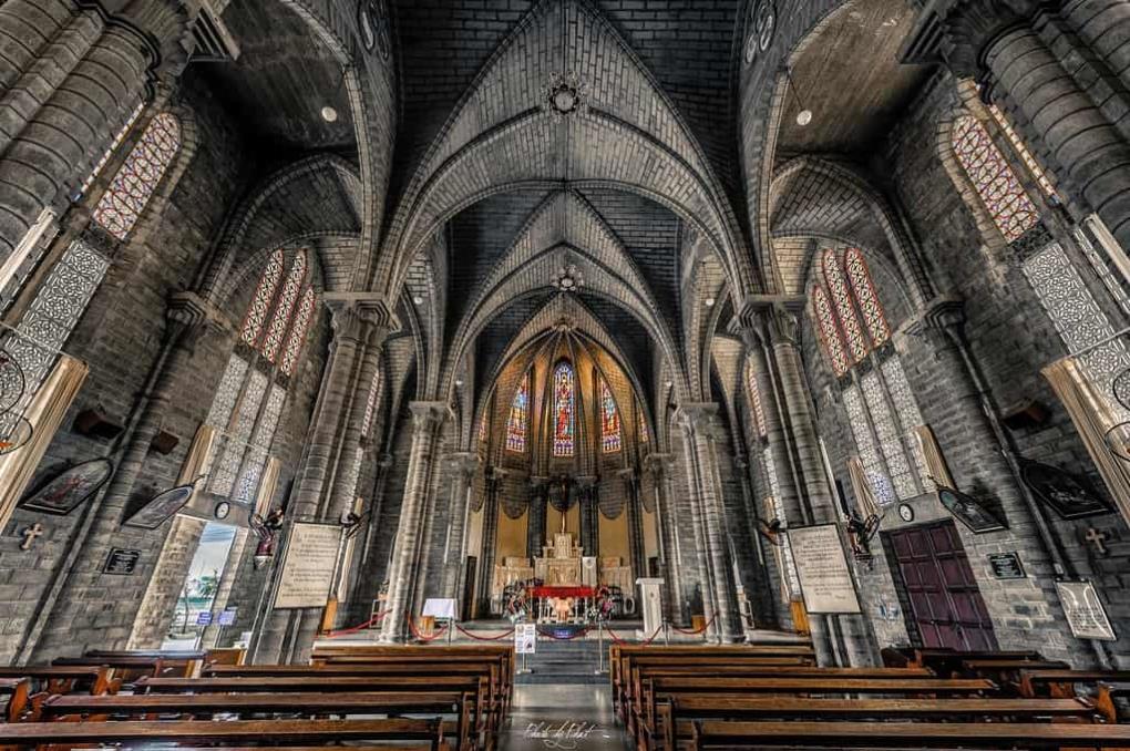 Phía trong nhà thờ không gian rộng, thoáng, phân thành khu vực cung thánh và khu phía sau cung thánh mang vẻ thanh tịnh, trang nghiêm. Cửa sổ là những bức tranh Thánh, làm từ kính màu, khiến không gian của Thánh Đường tràn ngập ánh sáng.