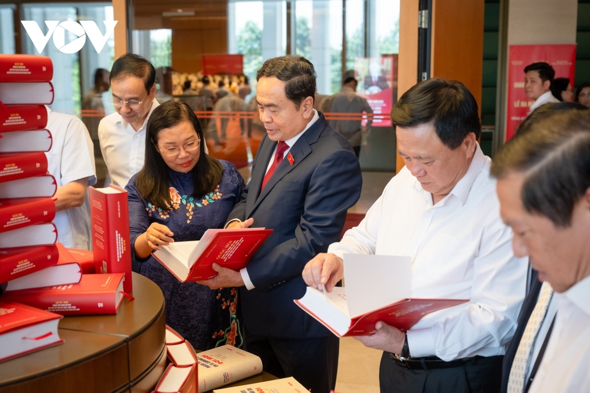 | Chủ tịch Quốc hội Trần Thanh Mẫn và các đại biểu trong lễ ra mắt cuốn sách của Tổng Bí thư Nguyễn Phú Trọng về Quốc hội. |