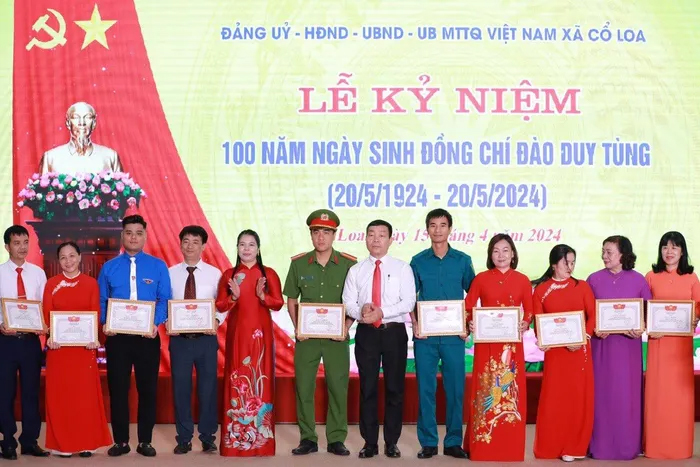 Nhân dịp này, Đảng ủy xã Cổ Loa đã khen thưởng cho 16 tập thể và 20 cá nhân có thành tích xuất sắc trong đợt thi đua cao điểm chào mừng kỷ niệm 100 năm Ngày sinh đồng chí Đào Duy Tùng.