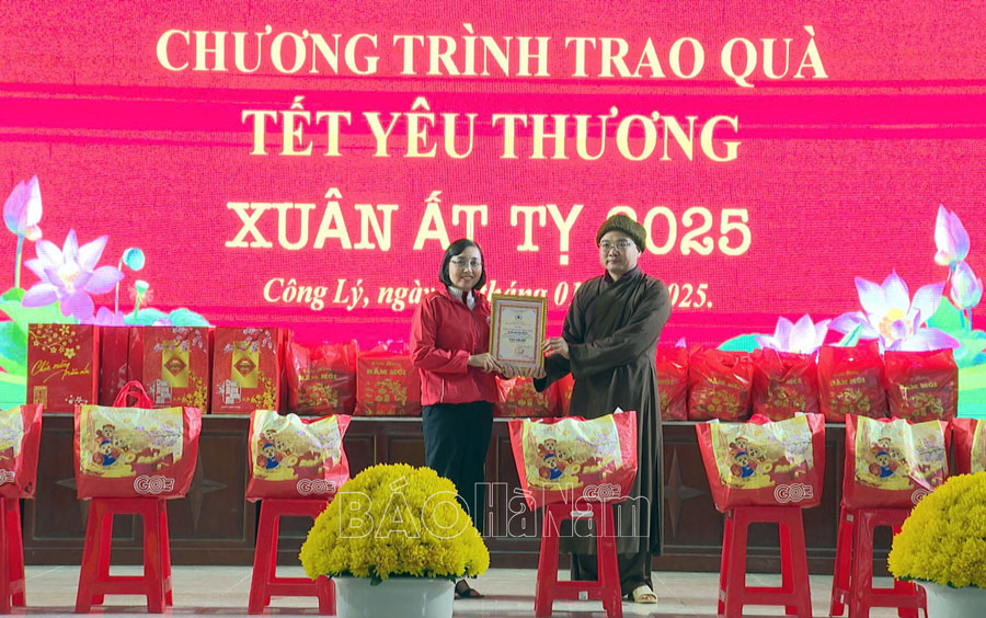 Hội CTĐ huyện Lý Nhân trao Bằng ghi nhận Tấm lòng vàng nhân đạo cho Đại đức Thích Giác Nguyên.Hội CTĐ huyện Lý Nhân và đại diện chính quyền địa phương trao quà Tết cho các hộ có hoàn cảnh khó khăn tại chương trình.