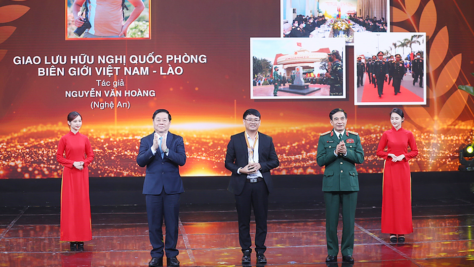 | Đại tướng, Bộ trưởng Bộ Quốc phòng Phan Văn Giang và Trưởng Ban Tuyên giáo Trung ương Nguyễn Trọng Nghĩa trao Giải Vàng cho tác giả Nguyễn Văn Hoàng (Nghệ An) tác phẩm “Giao lưu hữu nghị Quốc phòng Việt Nam - Lào”.