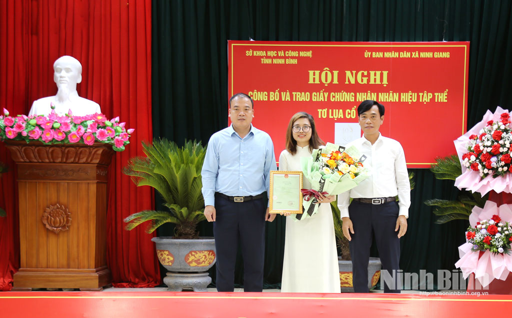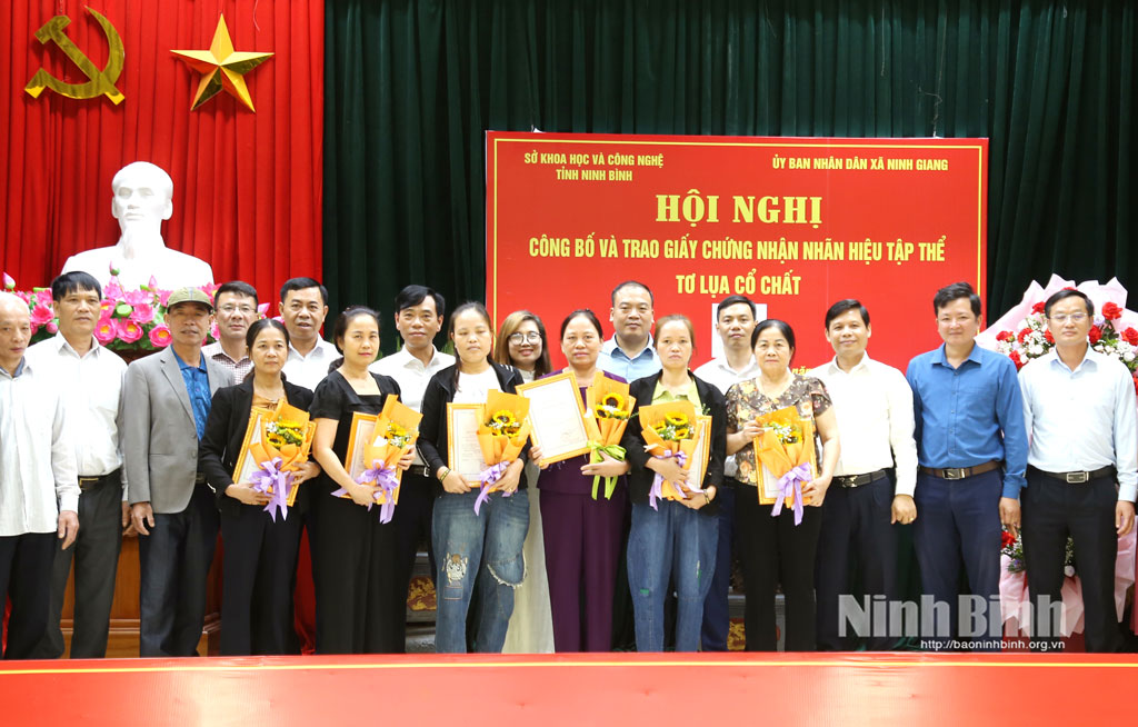 Đại diện Sở Khoa học và Công nghệ, chính quyền xã Ninh Giang trao Giấy chứng nhận nhãn hiệu tập thể “Tơ lụa Cổ Chất” cho Hợp tác xã Lụa Cổ Chất, xã Ninh Giang.Đại diện Sở Khoa học và Công nghệ, chính quyền xã Ninh Giang trao Giấy chứng nhận nhãn hiệu tập thể “Tơ lụa Cổ Chất” cho các thành viên Hợp tác xã Lụa Cổ Chất, xã Ninh Giang.