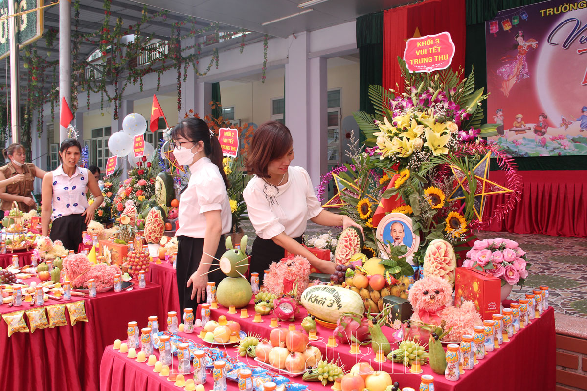 Để Tết trung thu thực sự là ngày hội của thiếu nhi, nhà trường đã tổ chức cho các khối lớp thi trưng bày mâm cỗ Trung thu. Với sự giúp đỡ của các thầy cô giáo và phụ huynh học sinh, các em đã làm các hoa quả tạo hình phong phú, trang trí mâm cỗ Trung thu đẹp mắt, thể hiện niềm vui và tính sáng tạo trong mỗi sản phẩm.