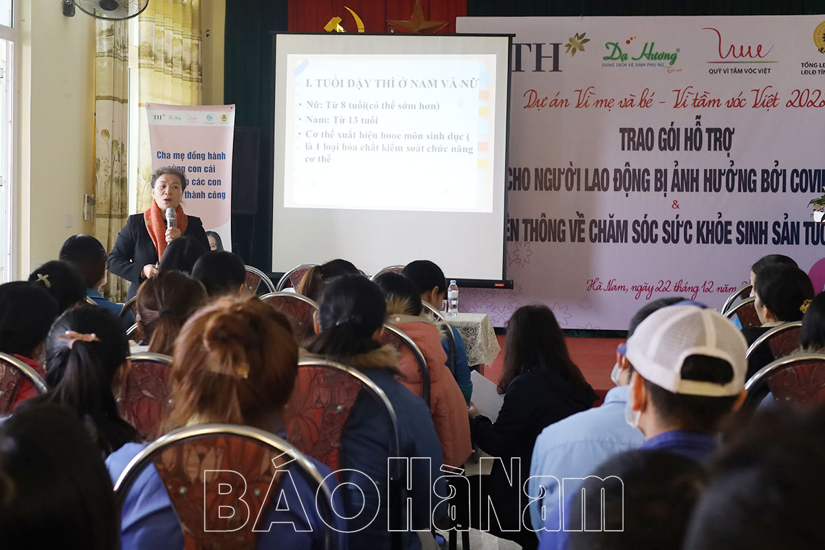 Chuyên gia Quỹ Vì tầm vóc Việt truyền thông về chăm sóc sức khỏe sinh sản tuổi dậy thì cho công nhân lao động tại KCN Đồng Văn.