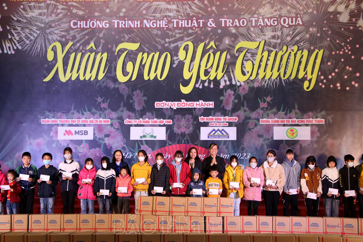 Đại diện Ban tổ chức trao tặng hoa cho các nhà tài trợ Chương trìnhCác cháu thiếu niên, nhi đồng có hoàn cảnh khó khăn của thành phố Phủ Lý nhận quà chương trình.Các cháu thiếu niên, nhi đồng có hoàn cảnh khó khăn của thị xã Duy Tiên nhận quà chương trình.Các cháu thiếu niên, nhi đồng có hoàn cảnh khó khăn của huyện Bình Lục nhận quà chương trình.Các cháu thiếu niên, nhi đồng có hoàn cảnh khó khăn của huyện Lý Nhân nhận quà chương trình.Các cháu thiếu niên, nhi đồng có hoàn cảnh khó khăn của huyện Kim Bảng nhận quà chương trình.Các cháu thiếu niên, nhi đồng có hoàn cảnh khó khăn của huyện Thanh Liêm nhận quà chương trình.