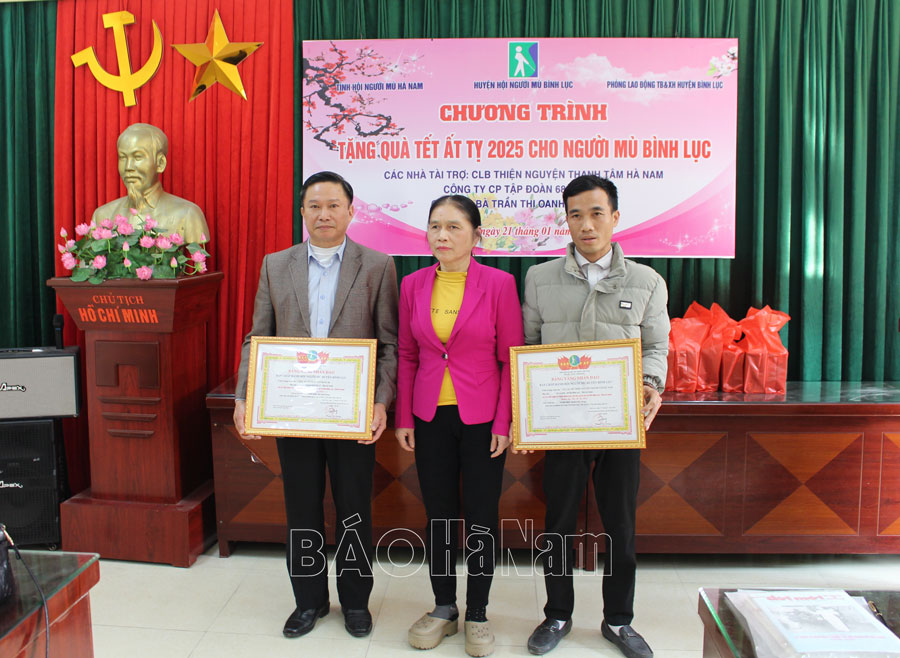 Hội Người mù huyện Bình Lục tặng Bảng vàng nhân đạo cho hai nhà tài trợ đã có tấm lòng từ thiện nhân đạo đối với Hội Người mù huyện Bình Lục.Lãnh đạo Hội Người mù tỉnh cùng Hội Chữ thập đỏ tỉnh trao tặng những suất quà cho hội viên có hoàn cảnh khó khăn.