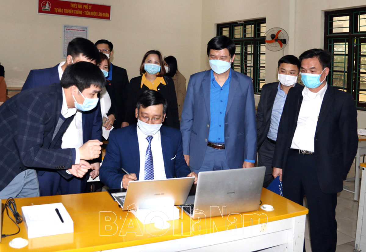 Các đại biểu tham quan phòng học thông minh.Lãnh đạo Tỉnh đoàn và các nhà tài trợ trao phòng học thông minh cho thầy và trò Trường THCS Trần Phú, phường Minh Khai, thành phố Phủ Lý.