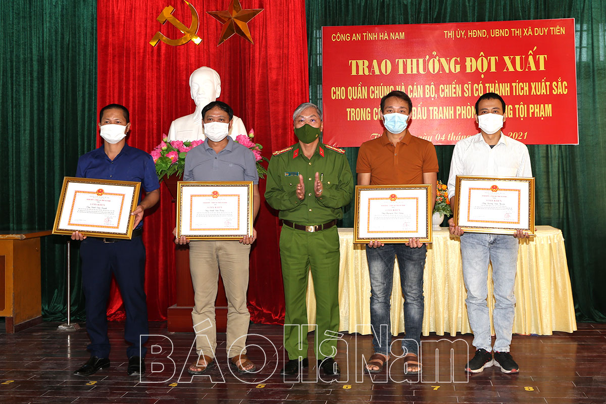 Lãnh đạo UBND thị xã Duy Tiên trao thưởng và Giấy khen cho các tập thể, cá nhân có thành tích xuất sắc trong điều tra, khám phá nhanh vụ án cướp tài sản.Lãnh đạo Công an tỉnh trao Giấy khen cho các công dân tiêu biểu tham gia đấu tranh bắt giữ đối tượng cướp tài sản.