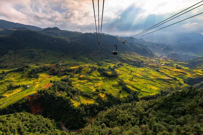 Cáp treo Fansipan băng qua thung lũng Mường Hoa mùa lúa chín. (Ảnh: SunworldFansipanLegend)
