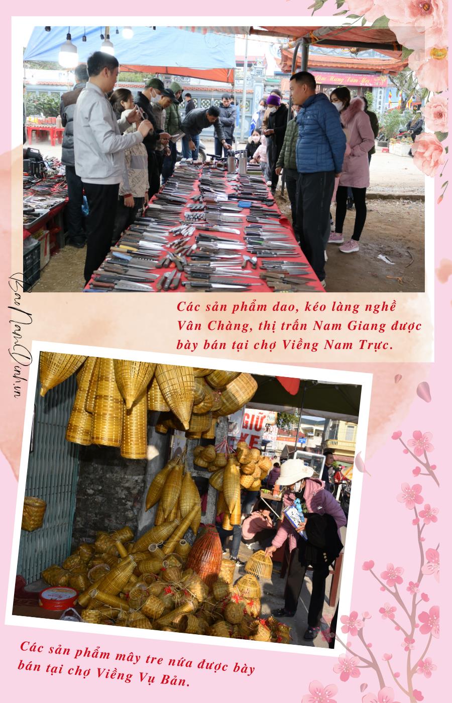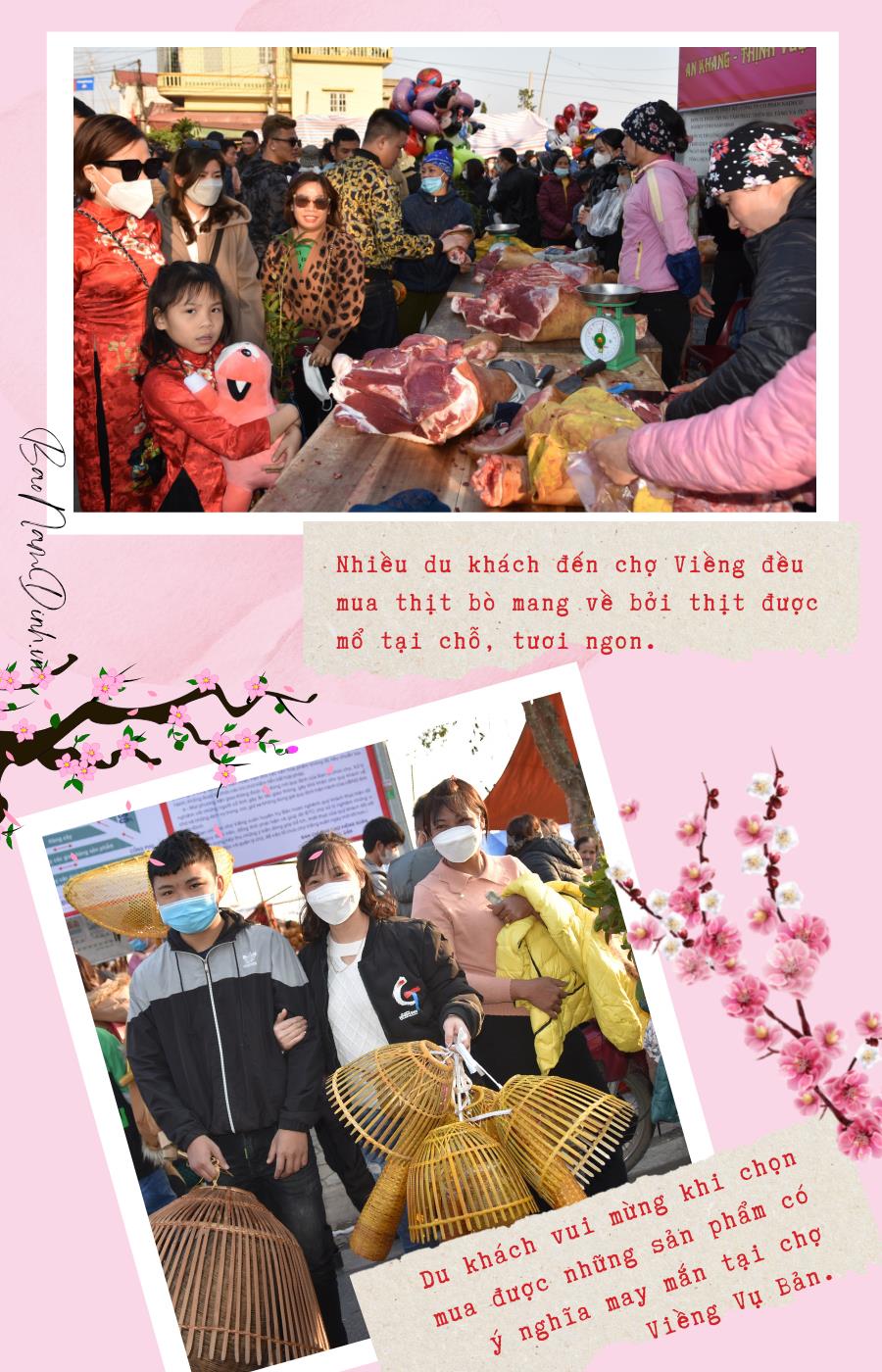 Tham dự chợ Viềng, người dân không chỉ vãn cảnh, chiêm bái các di tích đình, đền, chùa, phủ mà còn trao đổi, mua bán những vật dụng mang ý nghĩa cầu may, sản phẩm làng nghề truyền thống của người nông dân. Hàng hóa ở chợ Viềng rất phong phú, đa dạng, tạo thành "cuộc triển lãm" kinh tế - xã hội không chỉ của 2 huyện Vụ Bản và Nam Trực. Ở đây có đủ loại từ: nông cụ, hàng thủ công mỹ nghệ mây tre đan, đồ đồng, đồ gỗ, gốm sứ, đồ cổ, giả cổ đến hoa, cây cảnh nghệ thuật… và các loại sản phẩm tiêu dùng hiện đại được sản xuất bởi các cá nhân, doanh nghiệp trong và ngoài tỉnh. Trong đó, một mặt hàng đặc trưng của phiên chợ đặc biệt là thịt bò, thịt bê thui. Du khách đi chợ; ngoài thưởng thức bát phở bò, hay nồi lẩu bò, món tái nhúng, tái chanh... tại chỗ do chính những người địa phương chế biến, không cầu kỳ nhưng lại có dư vị thật đặc biệt bởi sự tươi ngon, chân chất của hương vị ẩm thực truyền thống, ai cũng mua thịt bò, thịt bê mang về.