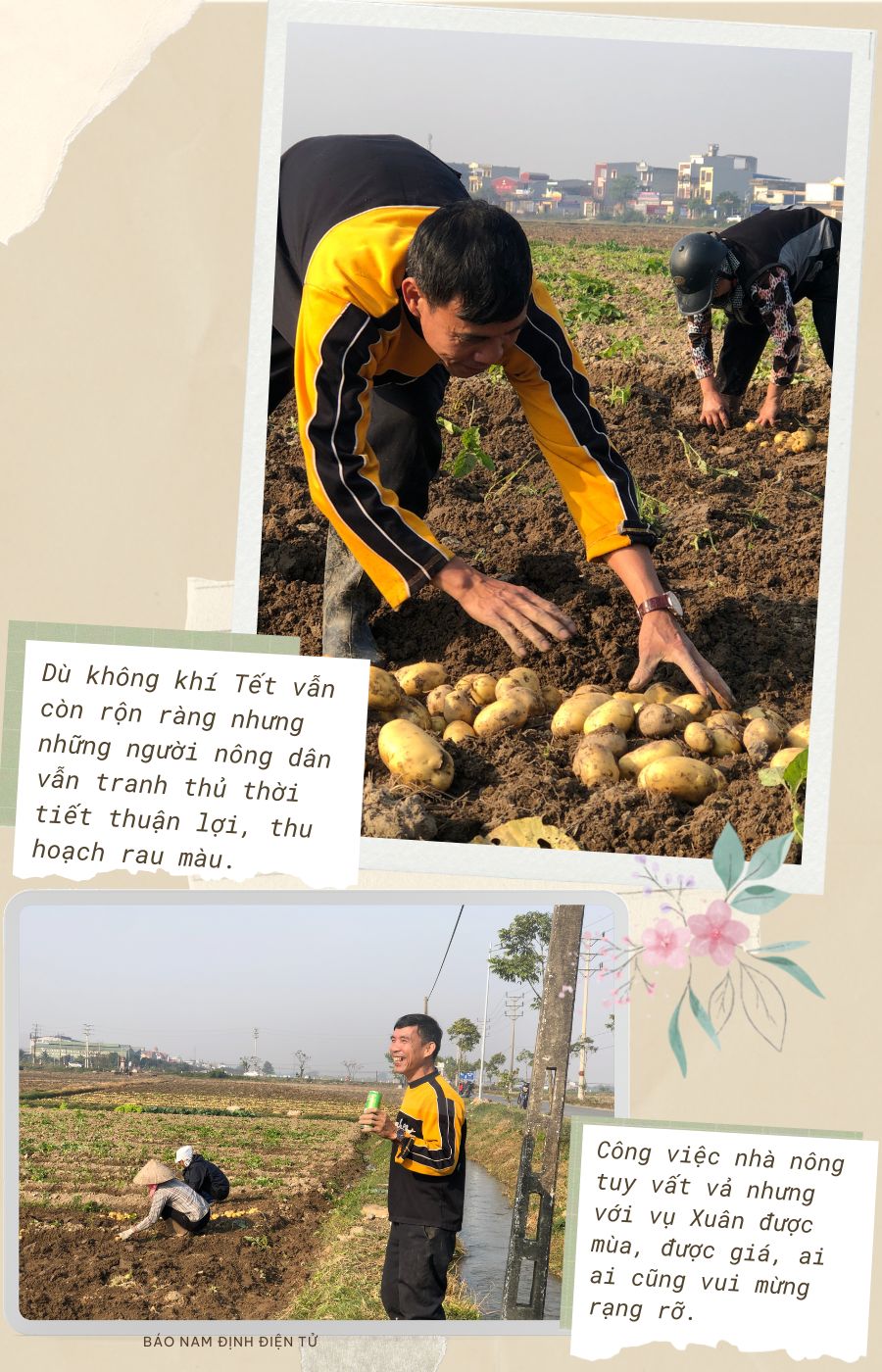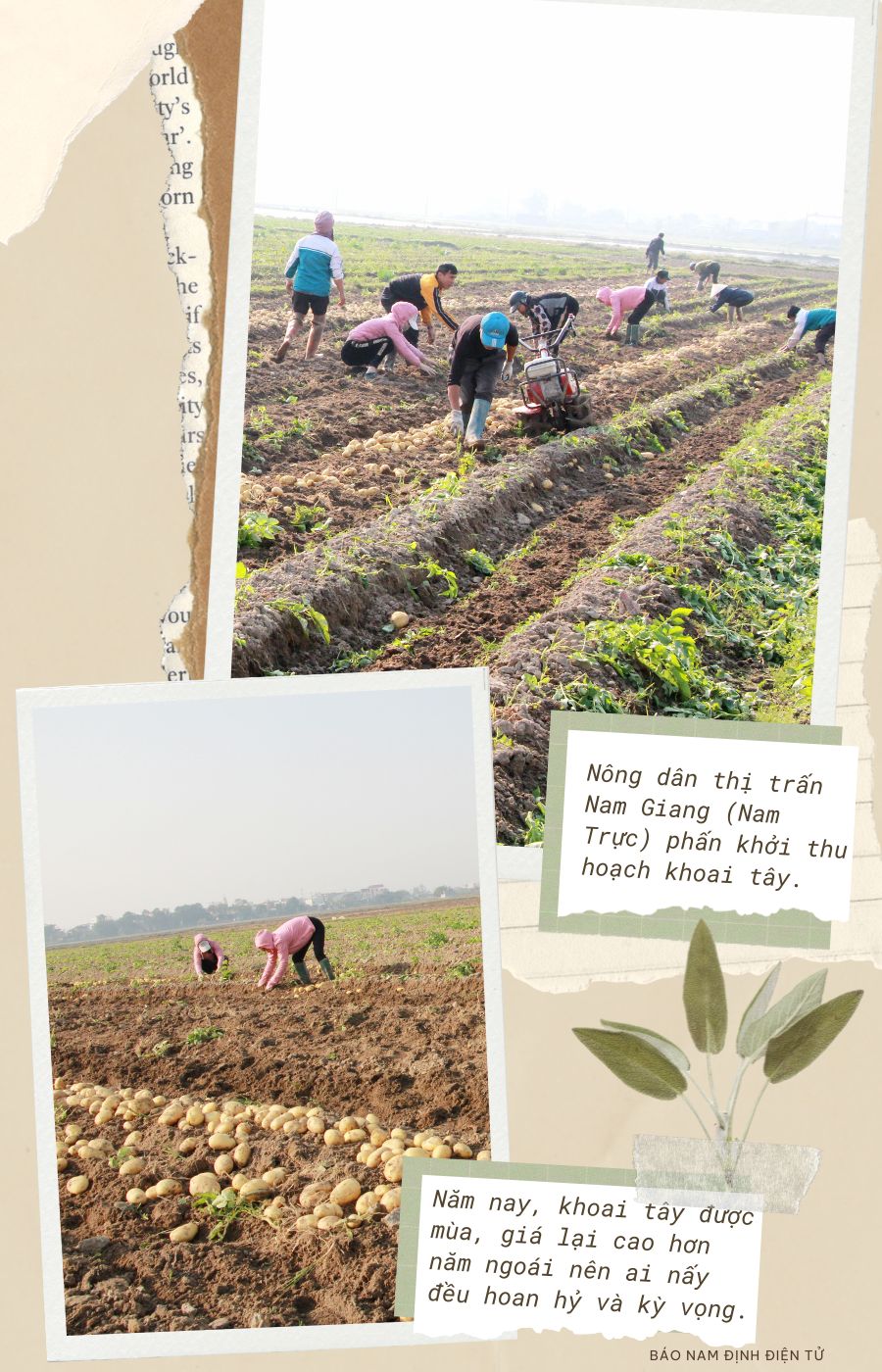 Trên cánh đồng thị trấn Nam Giang (Nam Trực), các bà, các chị vừa tranh thủ thu hoạch khoai tây xen lẫn tiếng cười nói rộn rã, đông vui như hội. Bà con nông dân phấn khởi cho biết, không khí Tết vẫn còn song công việc đồng áng vẫn phải ưu tiên. Vì vậy, nhà có ruộng tập trung nhân lực ra đồng thu hoạch rau màu, làm đất cho kịp khung thời vụ. Năm nay, khoai tây được mùa, giá lại cao hơn năm ngoái (từ 6.000 lên 9.000 đồng/kg) nên ai nấy đều vui tươi, hy vọng một mùa màng bội thu.