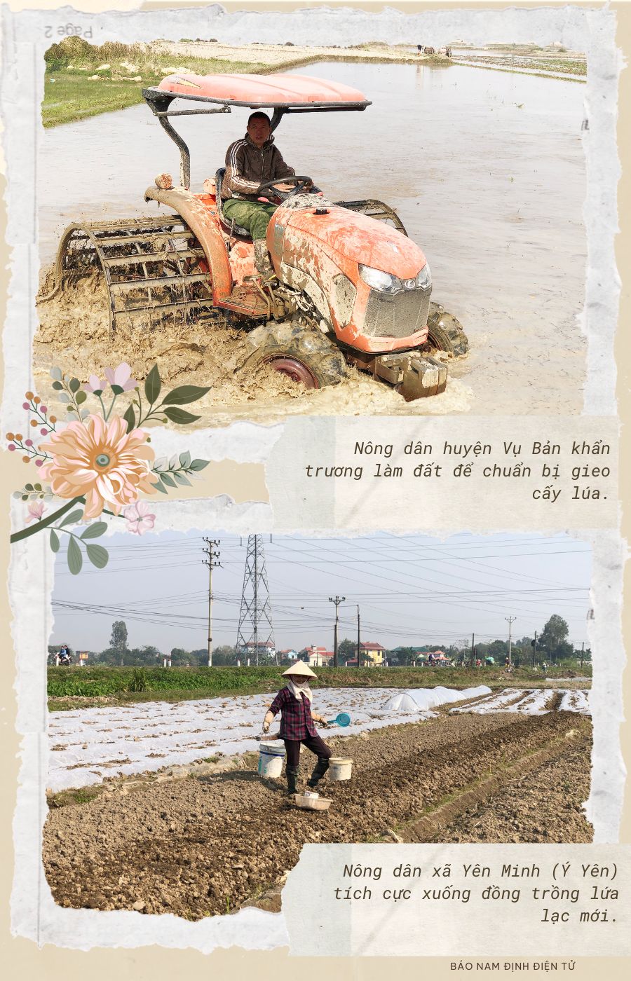 Từ mùng 4 Tết, nhiều nông dân ở huyện Vụ Bản đã xuống đồng làm đất, chăm sóc mạ, khơi thông kênh mương bảo đảm lấy nước vào đồng ruộng. Trước Tết, huyện đã chỉ đạo các ngành chức năng, chính quyền cơ sở khuyến khích bà con chủ động làm đất, khuyến cáo nông dân thực hiện đúng cơ cấu giống, chủ động ứng phó với thay đổi về thời tiết và gieo trồng trong khung thời vụ tốt nhất. Tranh thủ thời tiết ấm, nguồn nước thuận lợi, nông dân trong huyện đã thuê mượn dịch vụ cày bừa, tích cực làm đất, hạn chế tác động bất lợi do thiên tai, dịch họa mang lại. Tại xã Đại An, những công đoạn làm đất cuối cùng đang được người dân tích cực triển khai, đảm bảo ruộng chờ mạ.