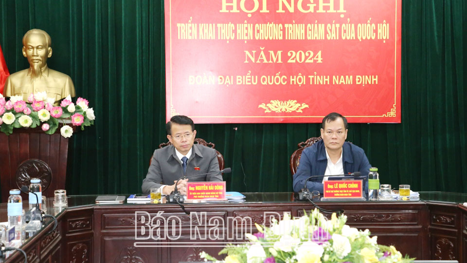 | Các đồng chí: Lê Quốc Chỉnh, Phó Bí thư Thường trực Tỉnh ủy, Chủ tịch HĐND tỉnh, Trưởng đoàn Đoàn đại biểu Quốc hội tỉnh; Nguyễn Hải Dũng, TUV, Phó trưởng đoàn chuyên trách Đoàn đại biểu Quốc hội tỉnh tham dự hội nghị tại điểm cầu Nam Định. |