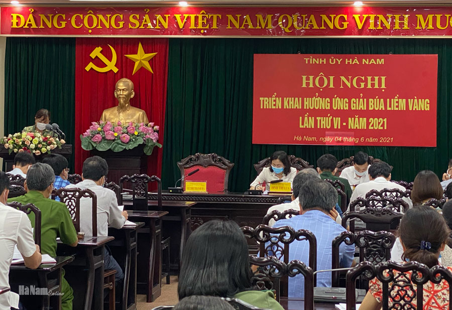 Tại hội nghị, sau khi công bố các quyết định thành lập: ban chỉ đạo, tổ giúp việc, tổ thư ký…, Ban chỉ đạo Giải Búa liềm vàng lần thứ VI- tỉnh Hà Nam đã triển khai dự thảo kế hoạch hưởng ứng Giải báo chí toàn quốc về xây dựng Đảng- Búa liềm vàng lần thứ VI năm 2021 đến đại biểu đại diện các ban, ngành, đoàn thể tỉnh, đại diện các huyện, thành, thị ủy, đảng ủy trực thuộc tỉnh và các cơ quan báo chí trong tỉnh.