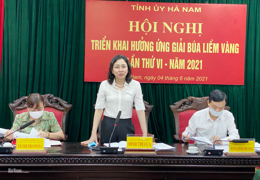 Phát biểu kết luận hội nghị, đồng chí Đinh Thị Lụa, Phó Bí thư Thường trực Tỉnh ủy, Trưởng Ban chỉ đạo Giải Búa liềm vàng lần thứ VI- tỉnh Hà Nam yêu cầu: các thành viên ban chỉ đạo, tổ giúp việc, tổ thư ký…tiếp tục nghiên cứu, bổ sung hoàn thiện dự thảo kế hoạch để chính thức ban hành và triển khai thực hiện trong thời gian sớm nhất. Đồng chí cũng yêu cầu các thành viên ban chỉ đạo, tổ giúp việc, tổ thư ký cùng thường trực các huyện, thị, thành ủy, đảng ủy trực thuộc, lãnh đạo cơ quan tuyên giáo và các ban xây dựng Đảng của Tỉnh ủy, các huyện, thị, thành ủy, đảng ủy trực thuộc tỉnh cùng các cơ quan báo chí trên cơ sở xác định rõ nhiệm vụ được phân công, quán triệt, triển khai thực hiện nghiêm nội dung kế hoạch hưởng ứng Giải báo chí toàn quốc về xây dựng Đảng- Búa liềm vàng lần thứ VI năm 2021. Cùng đó, thông tin, tuyên truyền, phổ biến sâu rộng mục đích, yêu cầu, nội dung, thể lệ của giải đến cán bộ, đảng viên, nhân dân nhằm thu hút đông đảo các đối tượng tham gia. Đồng thời, nghiên cứu lựa chọn hình thức tổ chức tập huấn nghiệp vụ phù hợp đối với từng loại hình báo chí và nhóm đối tượng tham gia hưởng ứng nhằm tạo sự đồng đều về số lượng cũng như chất lượng các tác giả, tác phẩm tham dự giải.