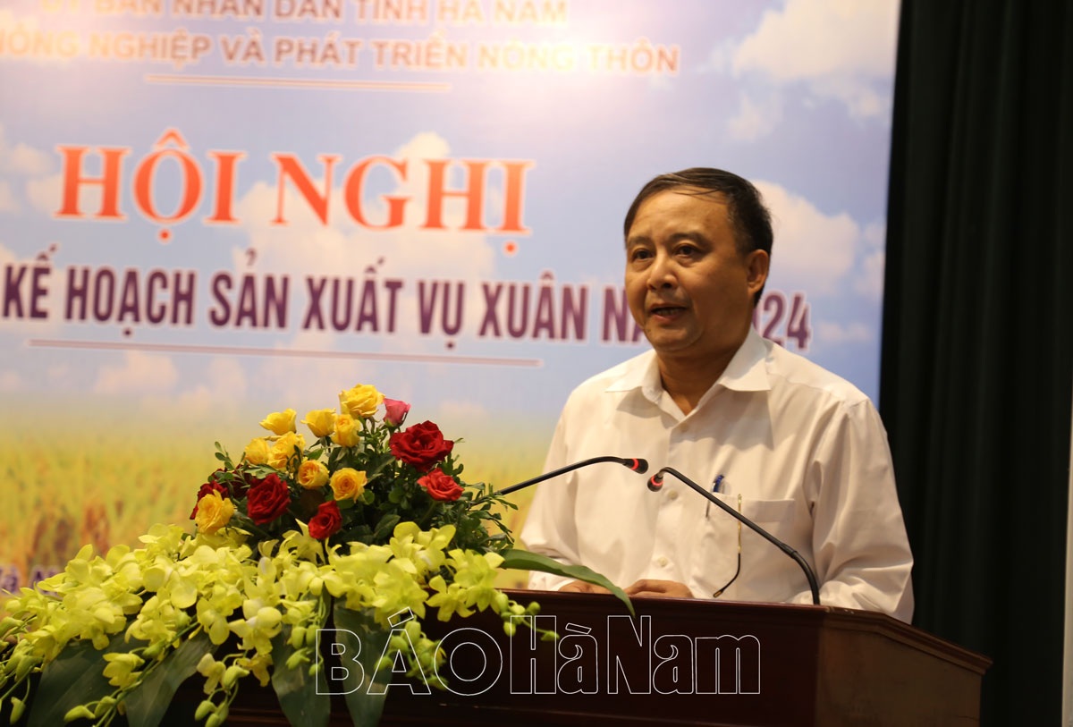 Phát biểu chỉ đạo tại hội nghị, đồng chí Nguyễn Đức Vượng, Tỉnh ủy viên, Phó Chủ tịch UBND tỉnh đánh giá cao kết quả đạt được trong sản xuất vụ xuân 2023. Với vụ xuân 2024, các địa phương bám sát vào chỉ đạo của Bộ NN & PTNT và của tỉnh, thực hiện với tinh thần chủ động; đẩy mạnh chuyển đổi cơ cấu giống, mở rộng các loại giống lúa chất lượng cho giá trị cao; áp dụng tiến bộ sản xuất, đưa cơ giới đồng bộ vào các khâu sản xuất; chú trọng công tác phòng trừ dịch bệnh cho lúa, cây trồng; phục vụ tốt công tác tưới, tiêu cho sản xuất, nhất là lấy nước đổ ải, làm đất đầu vụ; tăng cường công tác thanh kiểm tra thị trường, chất lượng giống, vật tư nông nghiệp phục vụ sản xuất. Đồng thời, nâng cao chất lượng phục vụ của các HTXDVNN làm tốt các khâu dịch vụ, chú trọng đến dịch vụ liên kết tiêu thụ sản phẩm. Các huyện, thành phố, thị xã xây dựng kế hoạch sản xuất vụ xuân 2024 sát với tình hình thực tế của địa phương…