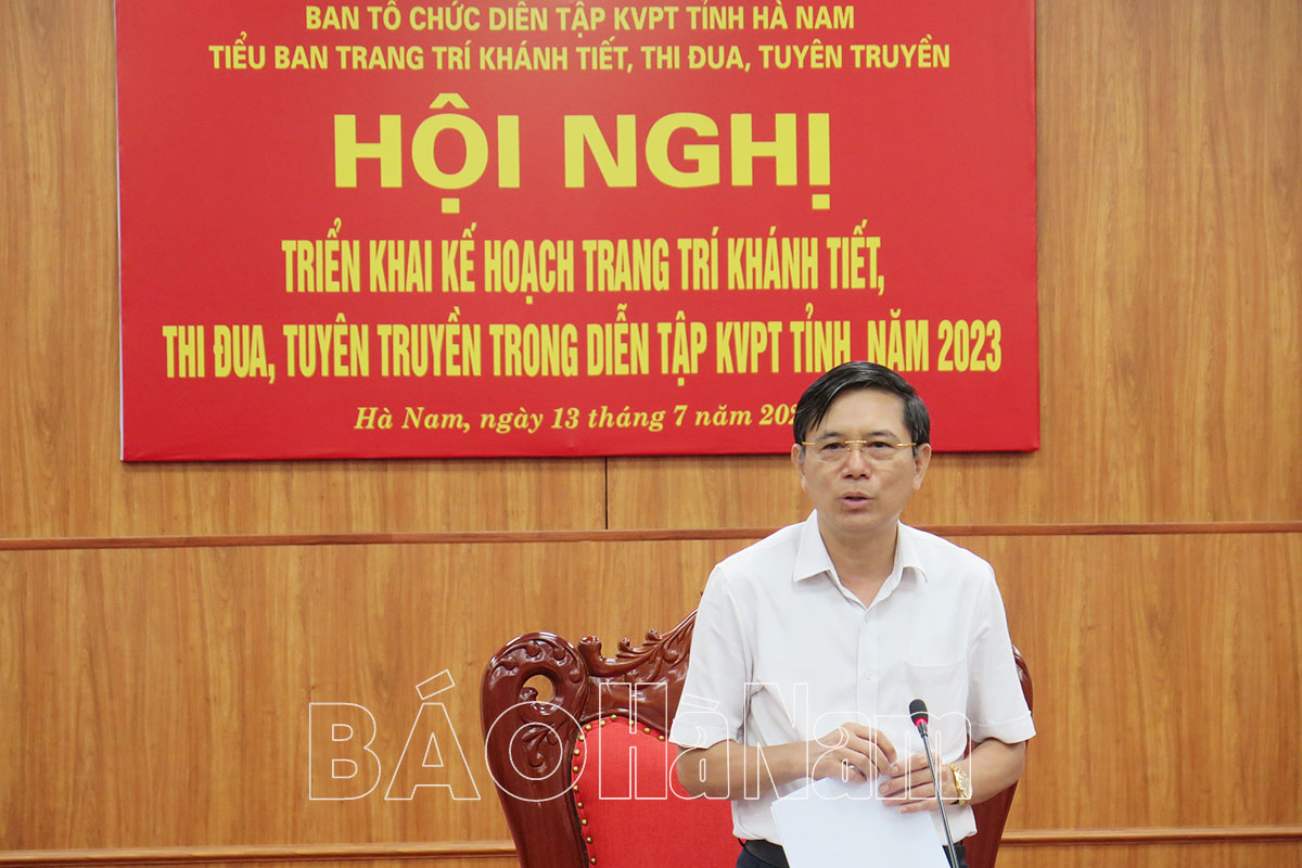 Phát biểu kết luận hội nghị, đồng chí Trần Xuân Dưỡng, Phó Chủ tịch UBND tỉnh, Phó trưởng Ban tổ chức diễn tập, Trưởng Tiểu ban trang trí khánh tiết, thi đua, tuyên truyền đã tổng hợp, làm rõ một số nội dung thảo luận tại hội nghị; phân công cụ thể nhiệm vụ cho từng thành viên tiểu ban. Đồng chí nhấn mạnh: diễn tập KVPT tỉnh là nhiệm vụ chính trị trọng tâm của tỉnh, để công tác diễn tập đạt kết quả tốt công tác trang trí khánh tiết, thi đua, tuyên truyền có vai trò rất quan trọng nhằm phổ biến sâu rộng quan điểm, chủ trương, đường lối, chính sách pháp luật của Đảng, Nhà nước, các văn bảo chỉ đạo của Chính phủ, Quân uỷ Trung ương, Bộ Quốc phòng về nhiệm vụ bảo vệ Tổ quốc trong tình hình mới; về nhiệm vụ xây dựng nền quốc phòng toàn dân, thế trận quốc phòng toàn dân gắn với thế trận an ninh nhân dân; xây dựng KVPT và diễn tập KVPT các cấp. Thông qua làm tốt công tác trang trí khánh tiết, thi đua, tuyên truyền giúp cho cán bộ, đảng viên, công chức, viên chức, lực lượng vũ trang và các tầng lớp nhân dân nhận thức sâu sắc thêm về ý nghĩa chính trị và tầm quan trọng của cuộc diễn tập trong thực hiện nhiệm vụ quân sự, quốc phòng địa phương, góp phần thực hiện tốt hai nhiệm vụ chiến lược xây dựng và bảo vệ Tổ quốc trong tình hình mới. Với tinh thần đó, đồng chí Phó Chủ tịch UBND tỉnh đề nghị các thành viên tiểu ban căn cứ thời gian, nội dung, nhiệm vụ cuộc diễn tập KVPT tỉnh chủ động phối hợp thực hiện tốt toàn bộ các nội dung về công tác trang trí khánh tiết, thi đua, tuyên truyền đảm bảo bám sát ý định, kế hoạch, nhiệm vụ của cuộc diễn tập, góp phần vào thành công của cuộc diễn tập KVPT tỉnh năm 2023.