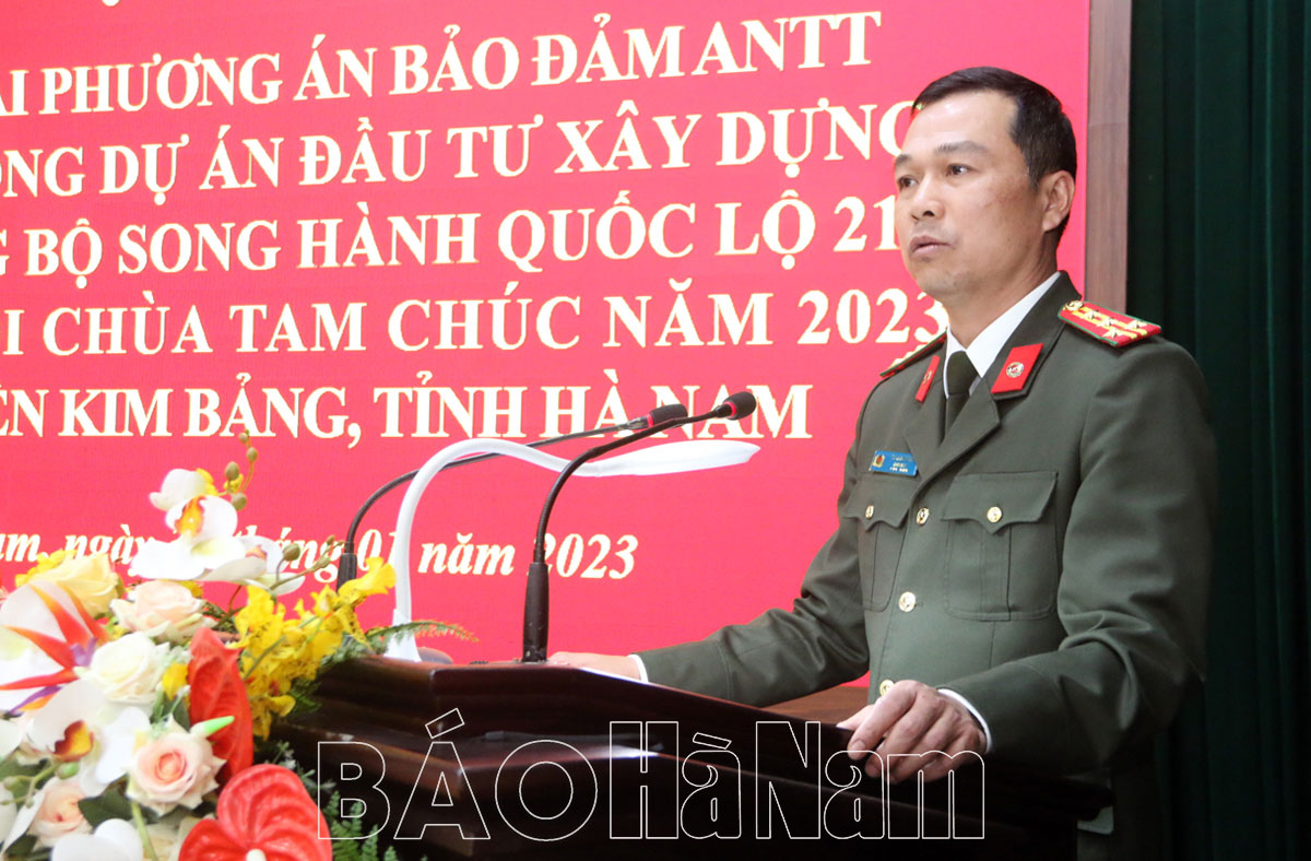 Phát biểu giao nhiệm vụ tại hội nghị, Đại tá Tô Anh Dũng, Ủy viên Ban Thường vụ Tỉnh ủy, Giám đốc Công an tỉnh yêu cầu các đơn vị được phân công tham gia bảo vệ lễ khởi công dự án đầu tư xây dựng tuyến đường bộ song hành QL21 và Lễ khai hội chùa Tam Chúc năm 2023 thực hiện nghiêm túc phương án, kế hoạch đề ra. Quán triệt nghiêm túc phương châm “5 rõ” (rõ người, rõ việc, rõ tiến độ, rõ kết quả, rõ trách nhiệm). Chủ động nêu cao tinh thần đoàn kết, khắc phục khó khăn thi đua hoàn thành xuất sắc nhiệm vụ được giao./.