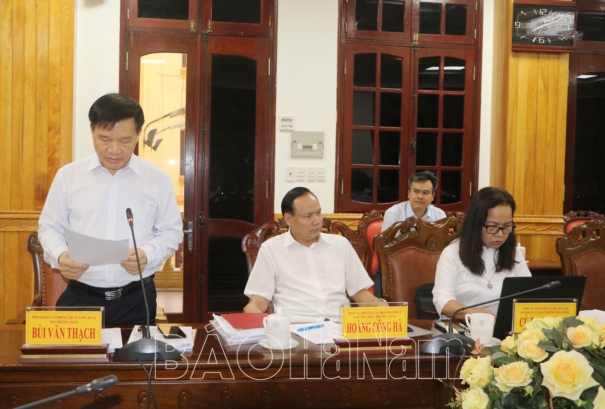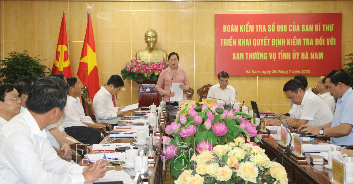 Tại buổi làm việc, đồng chí Bùi Văn Thạch, Phó Chánh Văn phòng Trung ương Đảng, Phó trưởng Đoàn Kiểm tra số 890 đã công bố Quyết định và Kế hoạch kiểm tra. Theo đó, nội dung kiểm tra là kết quả việc lãnh đạo, chỉ đạo, tổ chức thực hiện Kết luận số 21-KL/TW, ngày 25/10/2021 của Ban Chấp hành Trung ương (khóa XIII) về đẩy mạnh xây dựng, chỉnh đốn Đảng và hệ thống chính trị; kiên quyết ngăn chặn, đẩy lùi, xử lý nghiêm cán bộ, đảng viên suy thoái về tư tưởng chính trị, đạo đức, lối sống, biểu hiện "tự diễn biến", "tự chuyển hóa"; tập trung vào nội dung đẩy mạnh đấu tranh, phòng, chống tham nhũng, lãng phí, tiêu cực, gắn với việc lãnh đạo, chỉ đạo thực hiện Chỉ thị số 26-CT/TW, ngày 09/11/2018 của Bộ Chính trị về tăng cường sự lãnh đạo của Đảng đối với các cơ quan bảo vệ pháp luật trong công tác điều tra, xử lý các vụ án, vụ việc phức tạp, dư luận quan tâm, của Ban Thường vụ Tỉnh ủy Hà Nam.