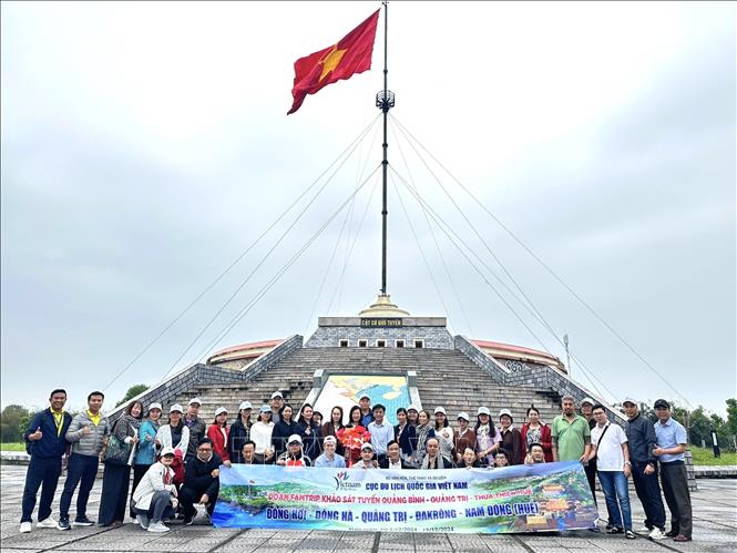 | Đoàn khảo sát du lịch (FAM-trip) tham quan Cột cờ tại Di tích quốc gia đặc biệt Đôi bờ Hiền Lương - Bến Hải. (Ảnh TTXVN) |