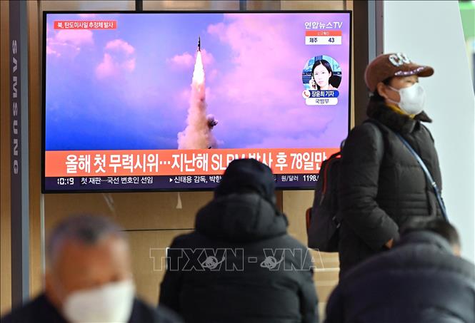 Người dân theo dõi qua truyền hình ở nhà ga Seoul (Hàn Quốc) về vụ phóng vật thể được cho là tên lửa đạn đạo của Triều Tiên, ngày 5/1/2022.