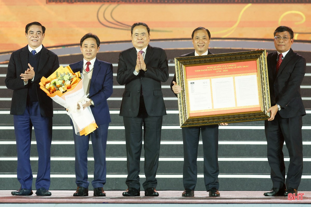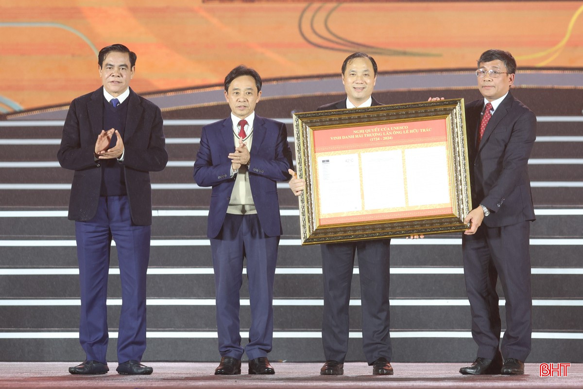 Tiếp đó, Thứ trưởng Thường trực Bộ Ngoại giao Nguyễn Minh Vũ - Chủ tịch Ủy ban quốc gia UNESCO Việt Nam trao Nghị quyết của UNESCO vinh danh Đại danh Y Hải Thượng Lãn Ông Lê Hữu Trác cho lãnh đạo tỉnh Hà Tĩnh.