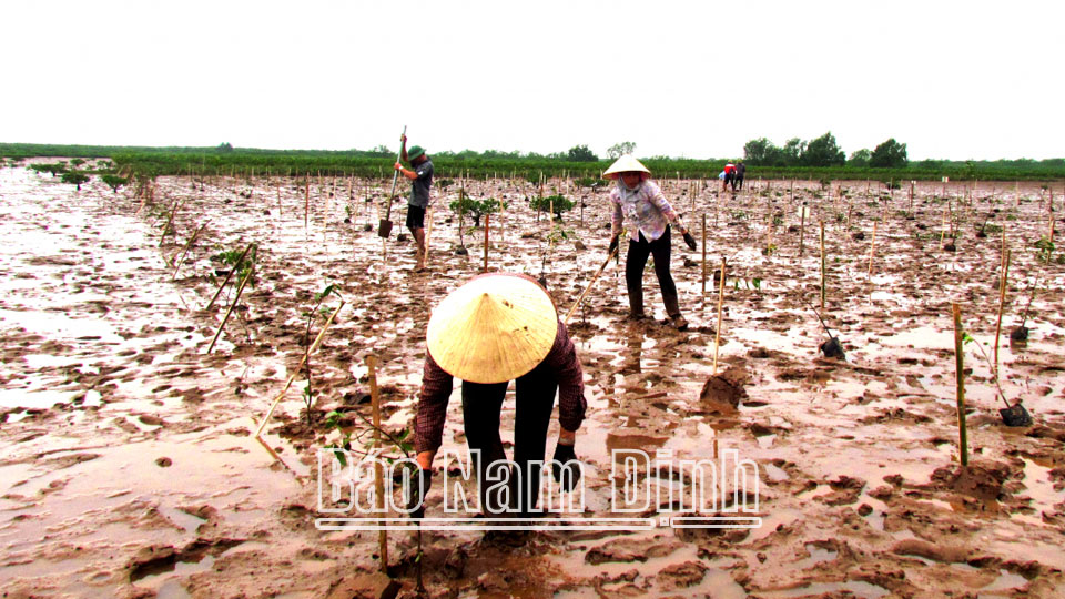 | Nhân dân xã Giao Thiện (Giao Thủy) tham gia trồng rừng ngập mặn khu vực Vườn Quốc gia Xuân Thủy. |