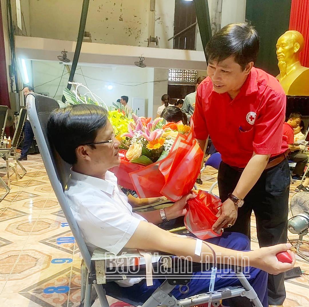 | Lãnh đạo Hội Chữ thập đỏ tỉnh tặng hoa động viên, khuyến khích người tham gia chương trình hiến máu tình nguyện huyện Trực Ninh. |
