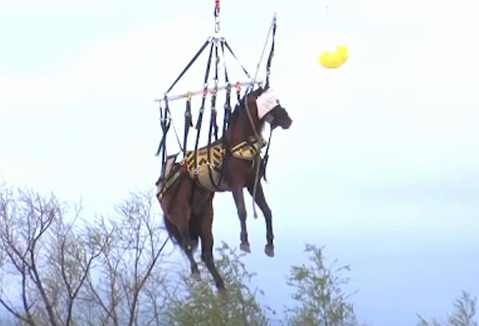 Cư dân trong khu vực đã chứng kiến khoảnh khắc căng thẳng khi con ngựa Caballero có tên Conquistador được trực thăng nâng lên khỏi lòng sông. Ảnh: ABC7.