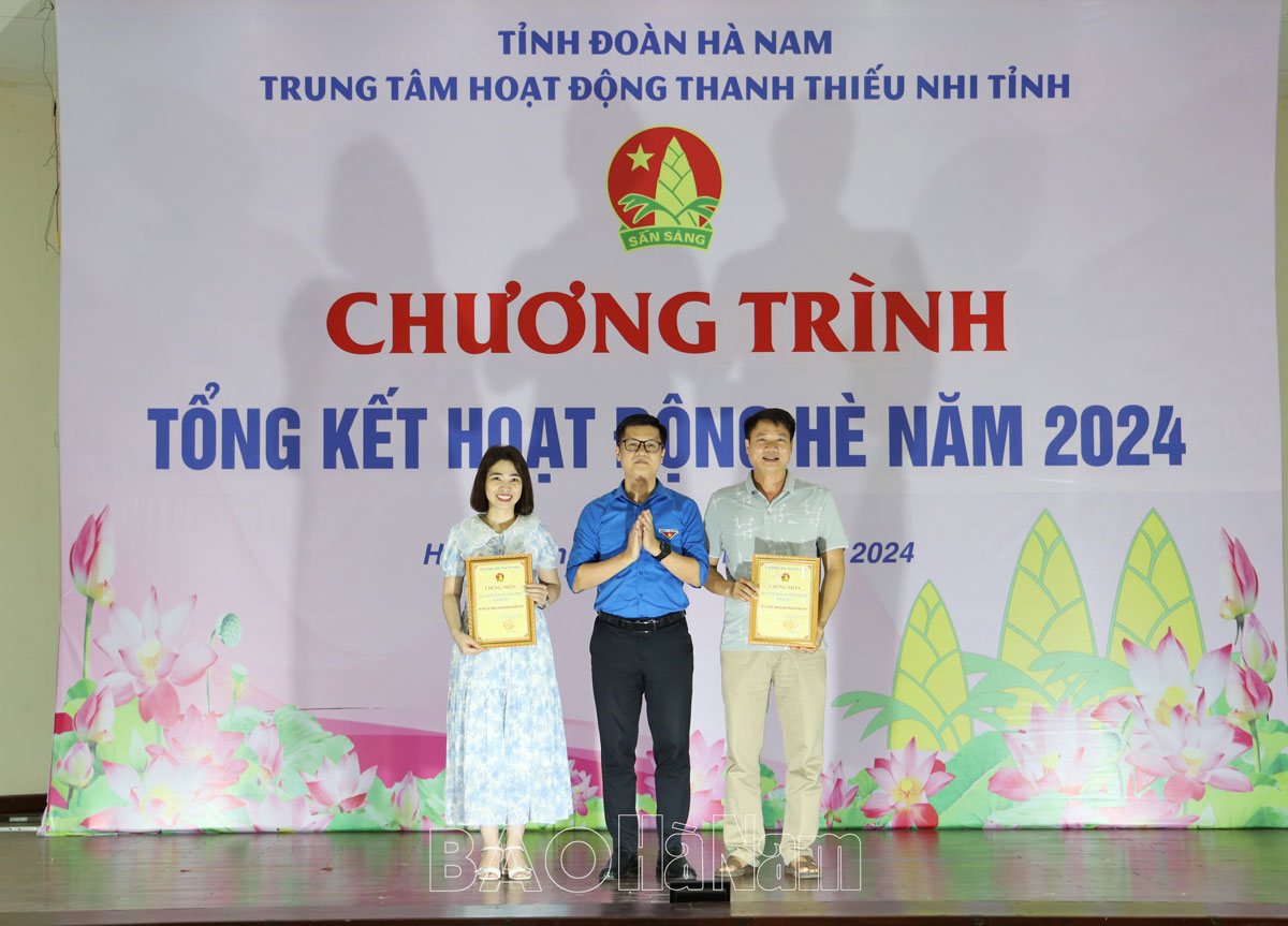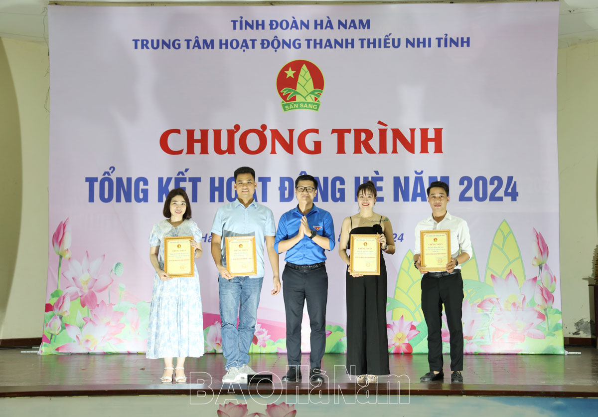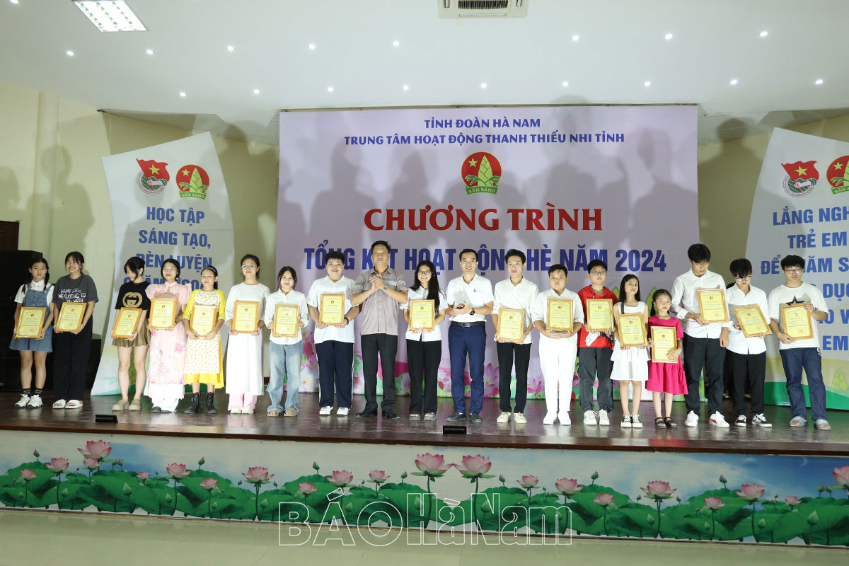 Lãnh đạo Trung tâm Hoạt động TTN tỉnh, Phòng GD và ĐT thành phố Phủ Lý khen thưởng các em có thành tích xuất sắc trong hoạt động hè.