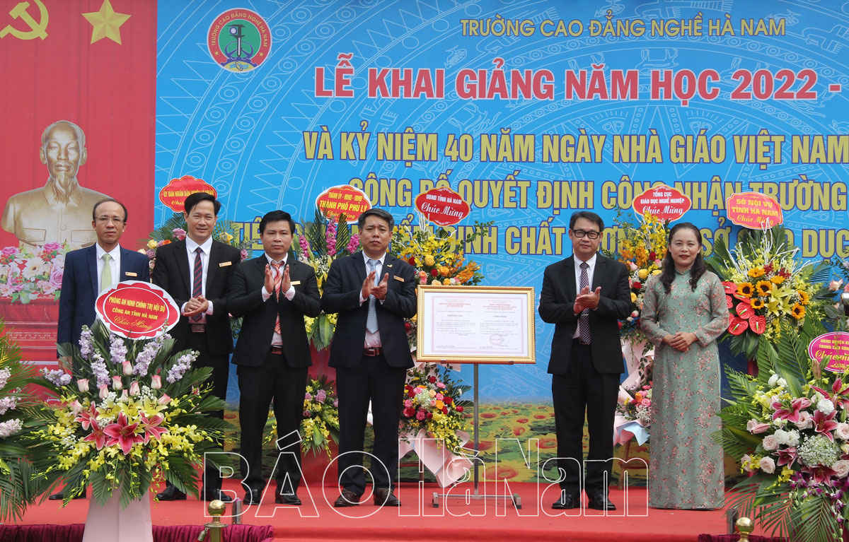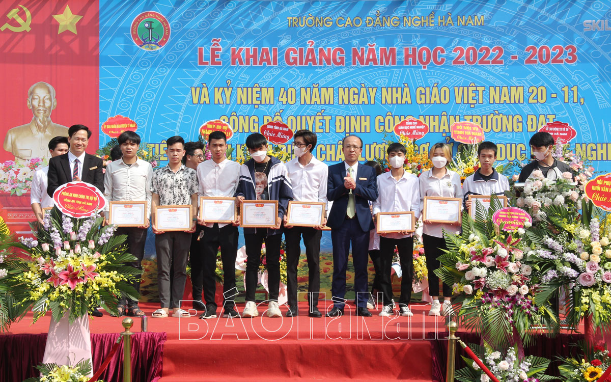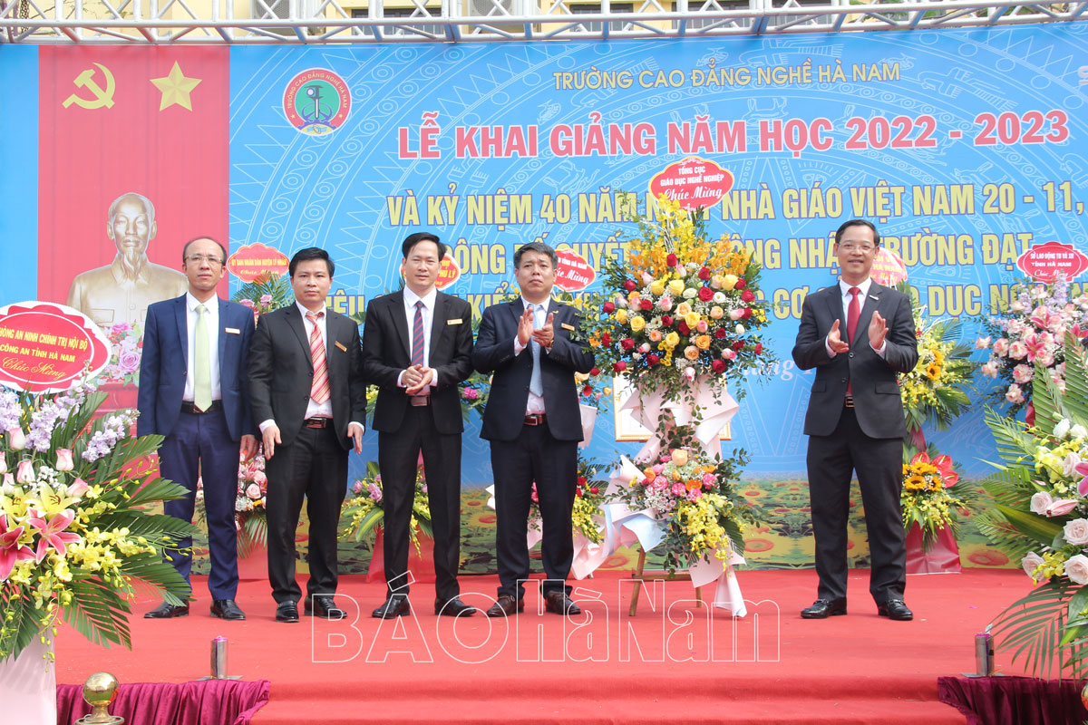 Sáng 20/11, Trường Cao đẳng Nghề Hà Nam tổ chức lễ Khai giảng năm học 2022 – 2023, kỷ niệm 40 năm ngày Nhà giáo Việt Nam 20/11 và Công bố quyết định công nhận trường đạt tiêu chuẩn kiểm định chất lượng cơ sở giáo dục nghề nghiệp. Dự lễ khai giảng có các đồng chí: Trương Anh Dũng, Tổng Cục trưởng Tổng cục Giáo dục nghề nghiệp, Bộ Lao động, Thương binh & Xã hội; Trần Xuân Dưỡng, TUV, Phó Chủ tịch UBND tỉnh; Nguyễn Đức Toàn, UVBTV Tỉnh ủy, Bí thư Thành ủy Phủ Lý.