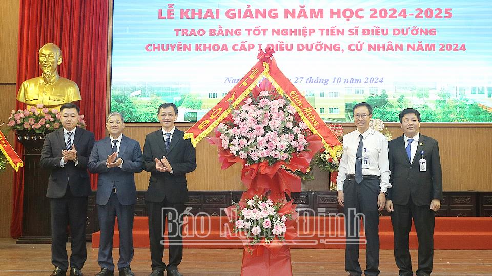 Phát biểu tại lễ khai giảng, đồng chí Thứ trưởng Bộ Y tế Nguyễn Tri Thức đề nghị Trường Đại học Điều dưỡng Nam Định tập trung phát huy những kết quả đã đạt được và thực hiện tốt các nhiệm vụ giáo dục đại học năm học 2024-2025. Hoàn thiện chiến lược phát triển, kiện toàn tổ chức bộ máy, huy động mọi nguồn lực để đổi mới và nâng cao năng lực quản trị đại học, đẩy mạnh thực hiện tự chủ đại học. Đổi mới, hiện đại hóa mạnh mẽ chương trình và phương thức đào tạo, đáp ứng tốt hơn nhu cầu nhân lực chất lượng cao ngành điều dưỡng, hộ sinh của thị trường lao động và nhu cầu học tập đa dạng của người học trong bối cảnh mới. Tăng cường ứng dụng công nghệ số, gắn với cải cách hành chính, đổi mới phương pháp dạy - học, kiểm tra, đánh giá đối với người học; đặc biệt chú trọng việc gắn lý thuyết với thực hành.