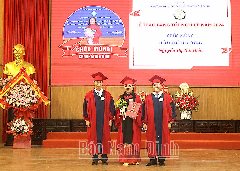 | Lãnh đạo Trường Đại học Điều dưỡng Nam Định trao Bằng Tiến sĩ Điều dưỡng cho nghiên cứu sinh. |