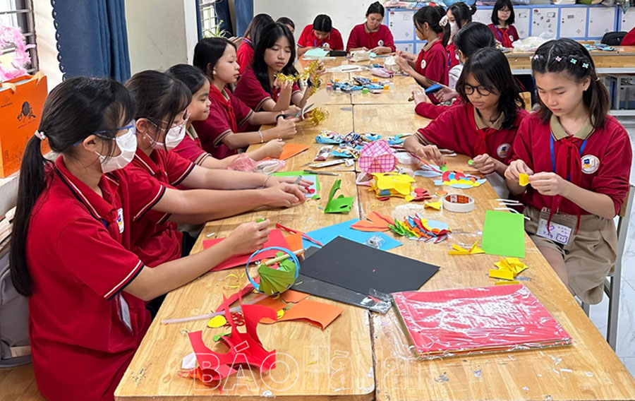 Các học sinh khối THCS đang thi đua làm đèn lồng để dự thi.