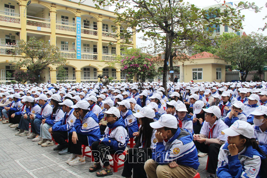 Các em học sinh Trường THCS Trần Quốc Toản chăm chú theo dõi buổi tuyên truyền.